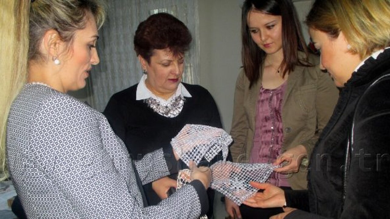 Merkezde tedavi amaçlı el becerisi kurslarına katılan hastalar tarafından yapılan el işi ürünleri inceleyen Şengül Yavuz beğendiği ürünleri de satın aldı.