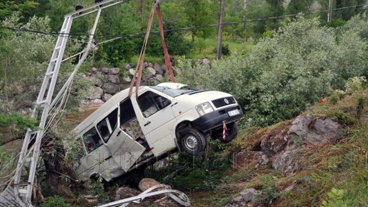 Gümüşhane’de işçileri taşıyan servis minibüsü Harşit çayına uçtu. Elektrik direğine çarparak durabilen minibüsteki 13 işçi yaralandı.