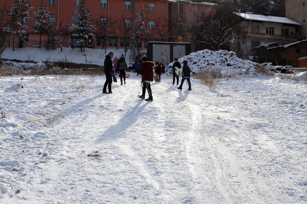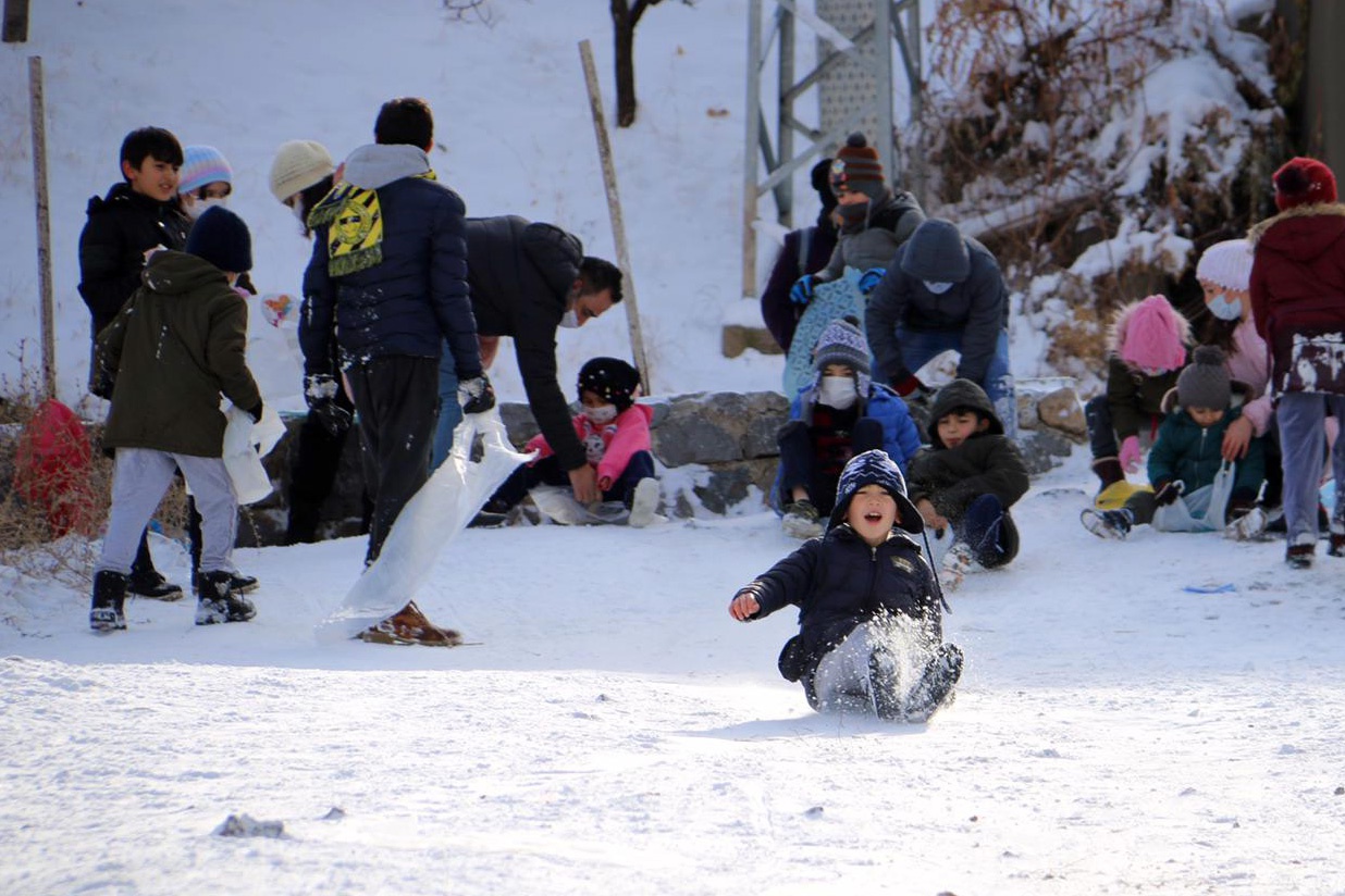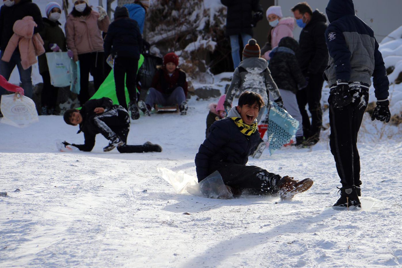 Kızlı erkekli onlarca çocuk Karşıyaka mahallesinin doğal pist sahası olan boş arazide evlerinden getirdikleri poşetlerle, plastik çantalarla ve bidonlardan kesilen parçaları kendilerine kızak yaparak saatlerce eğlendi.