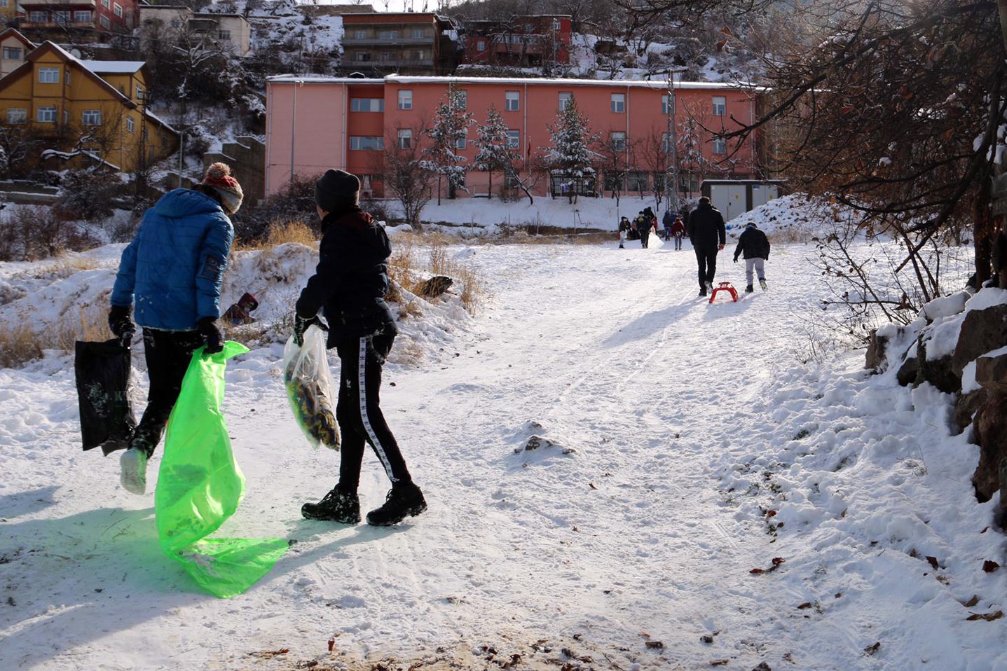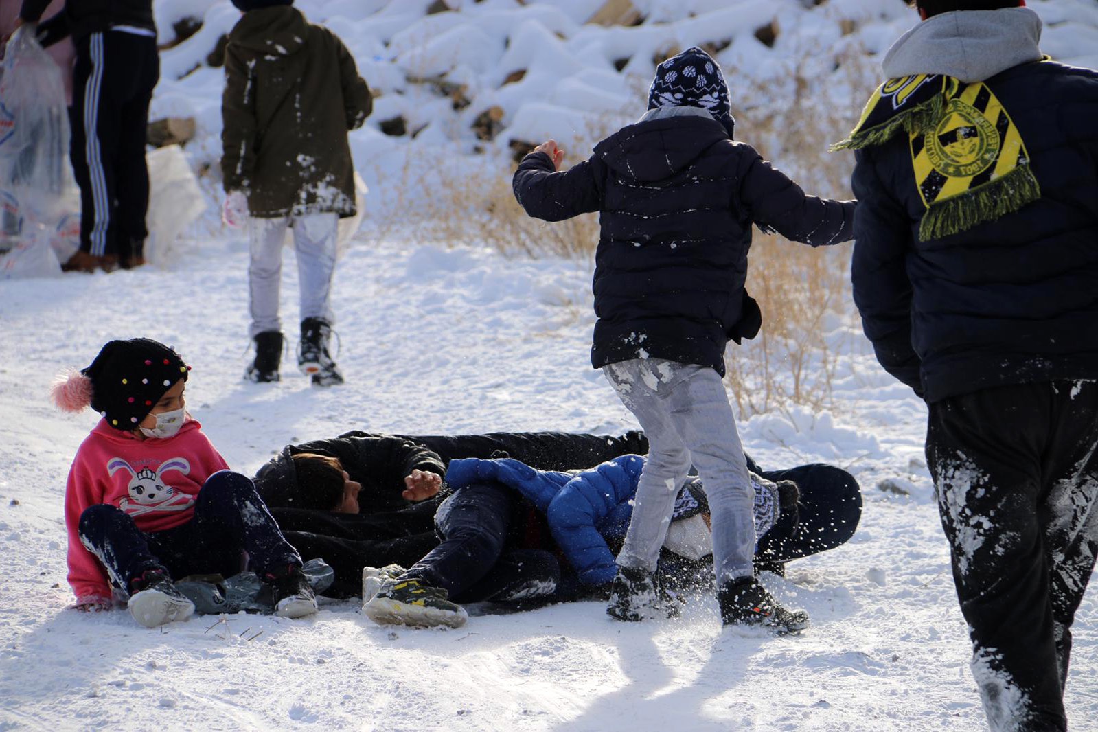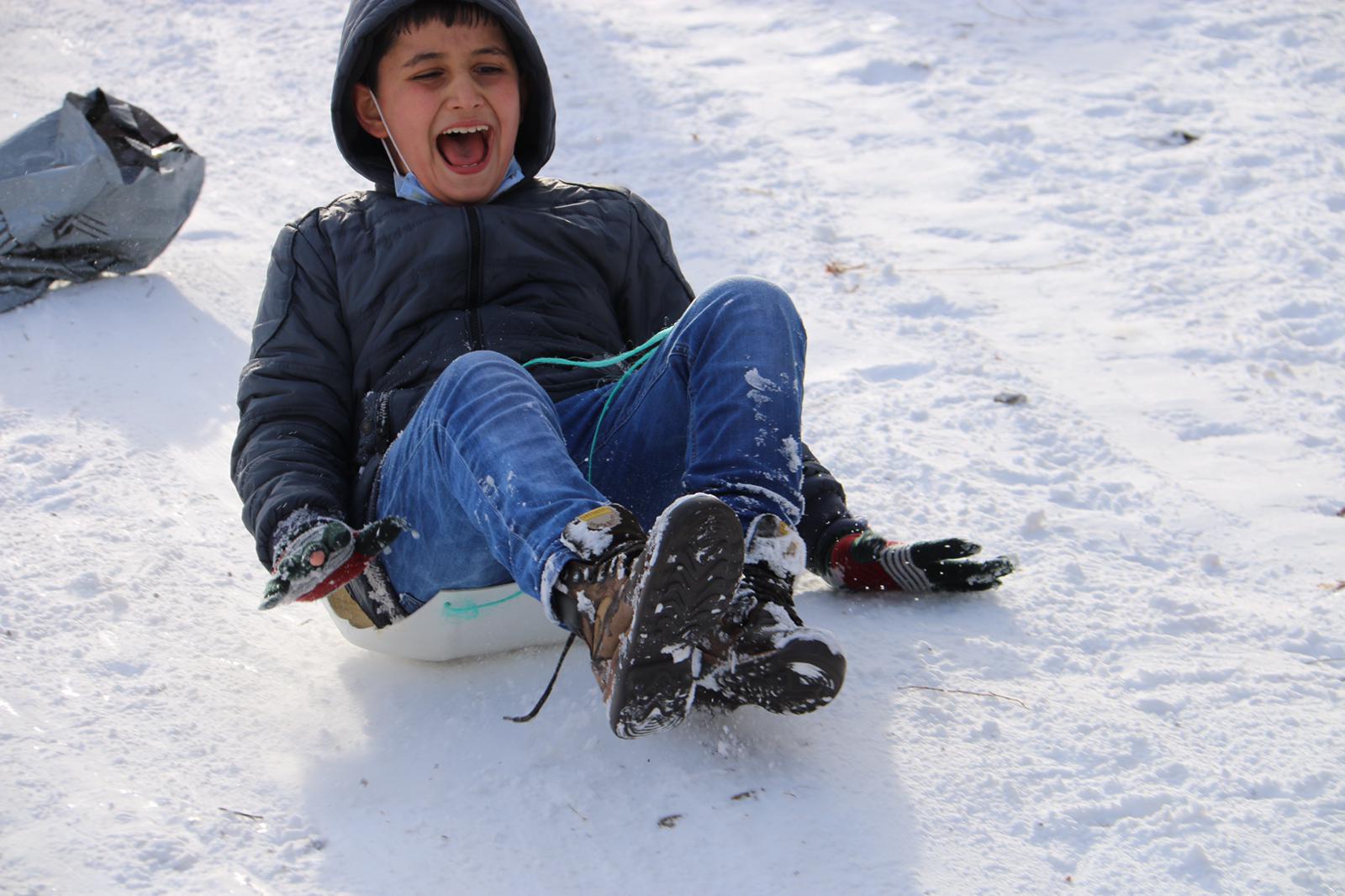 Kızlı erkekli onlarca çocuk Karşıyaka mahallesinin doğal pist sahası olan boş arazide evlerinden getirdikleri poşetlerle, plastik çantalarla ve bidonlardan kesilen parçaları kendilerine kızak yaparak saatlerce eğlendi.