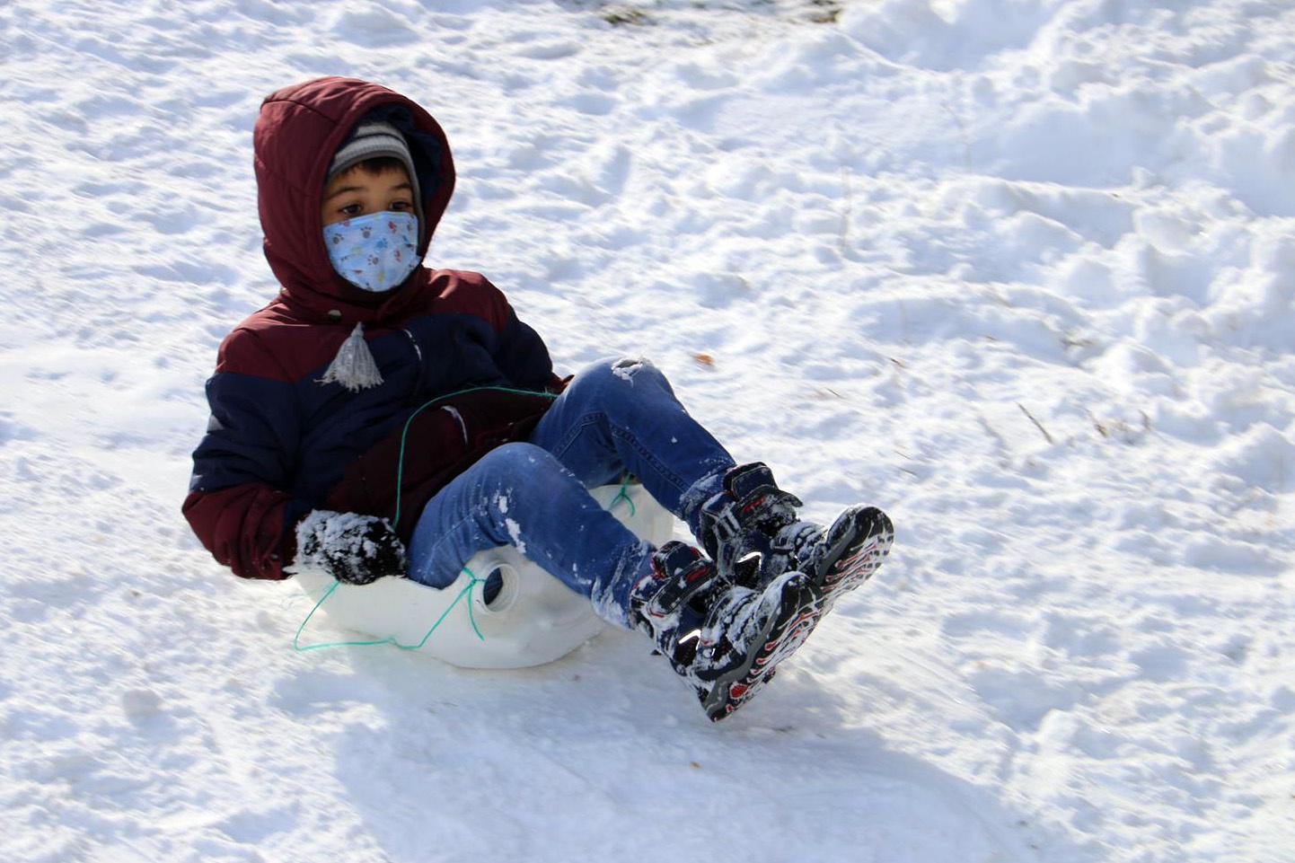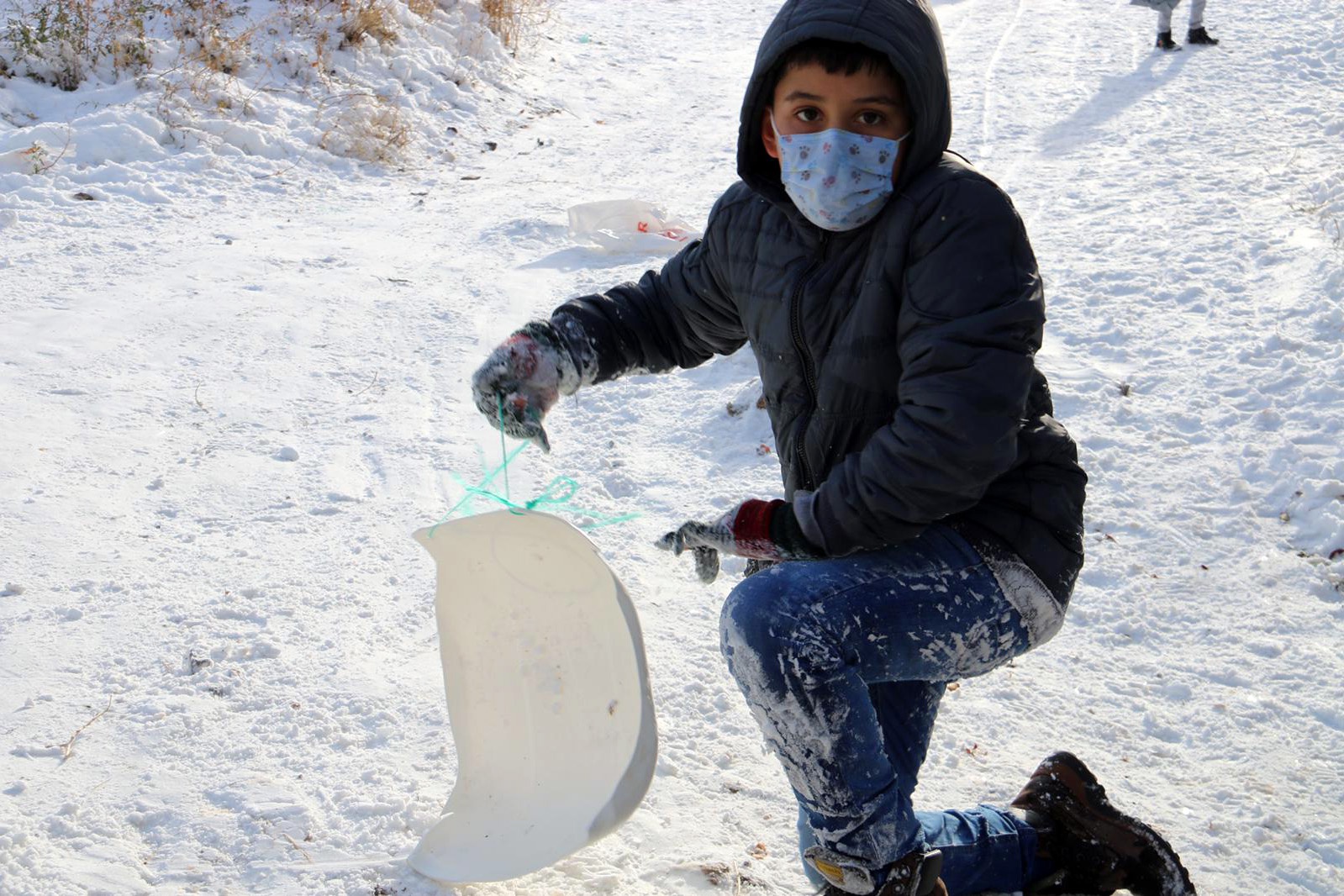 Sokağa çıkma kısıtlamasından muaf oldukları saatlerde yağışın ardından boş arazilerde buzlaşan kar kütlelerinden kendilerine kayak pisti yapan çocuklar, eğimli arazide kendi imkanlarıyla yaptıkları kızaklarla ailelerinin gözetiminde doyasıya eğlendi.