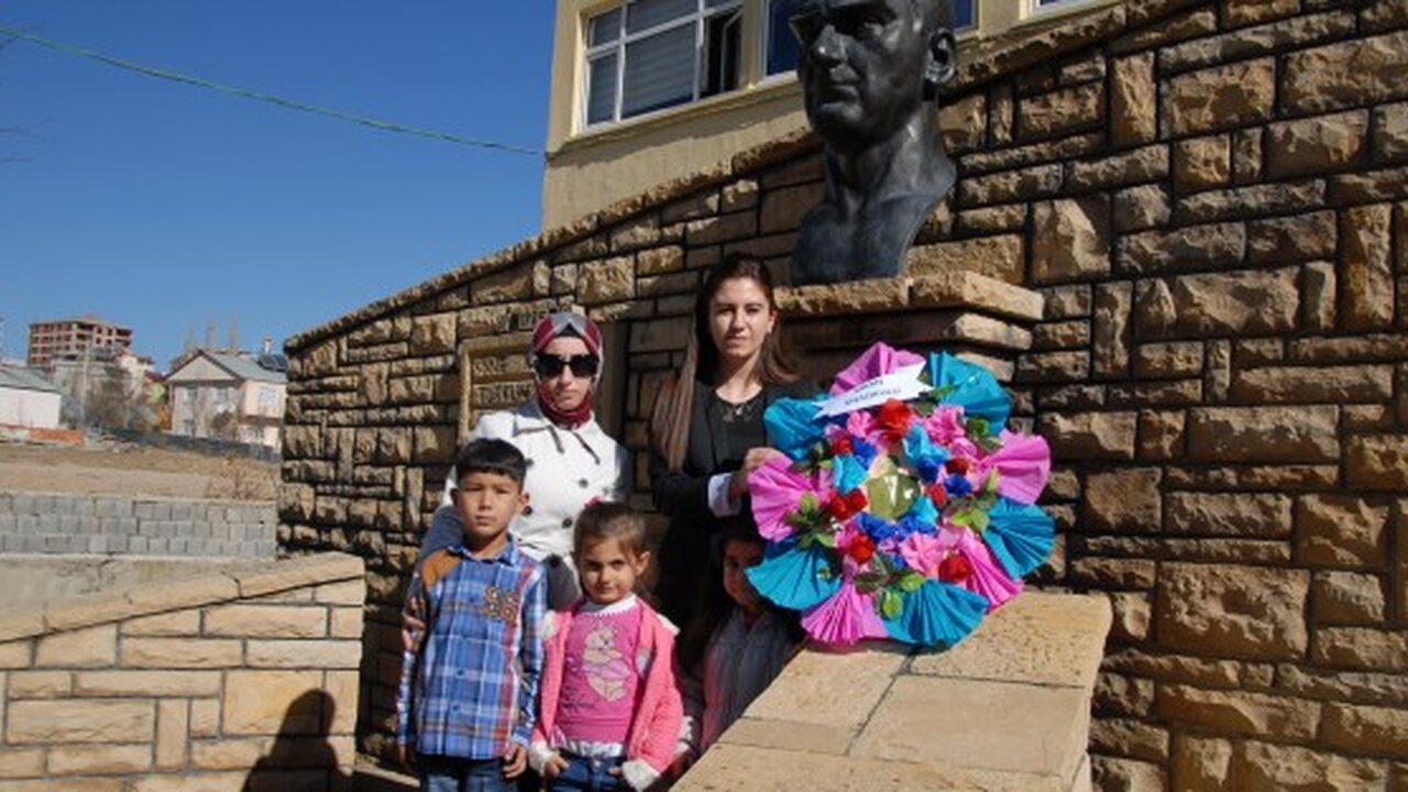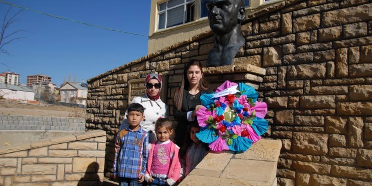 Minik öğrenciler çelengi ders esnasında yaptıklarını, 10 Kasım Atatürk'ü Anma Günü ve Atatürk Haftası nedeniyle ilçe Hükümet Konağı önündeki Atatürk anıtına bıraktıklarını söyledi.