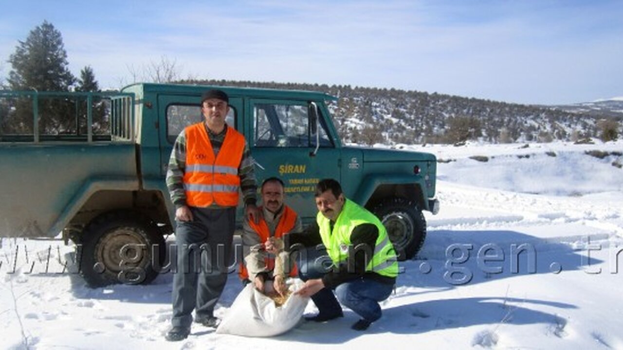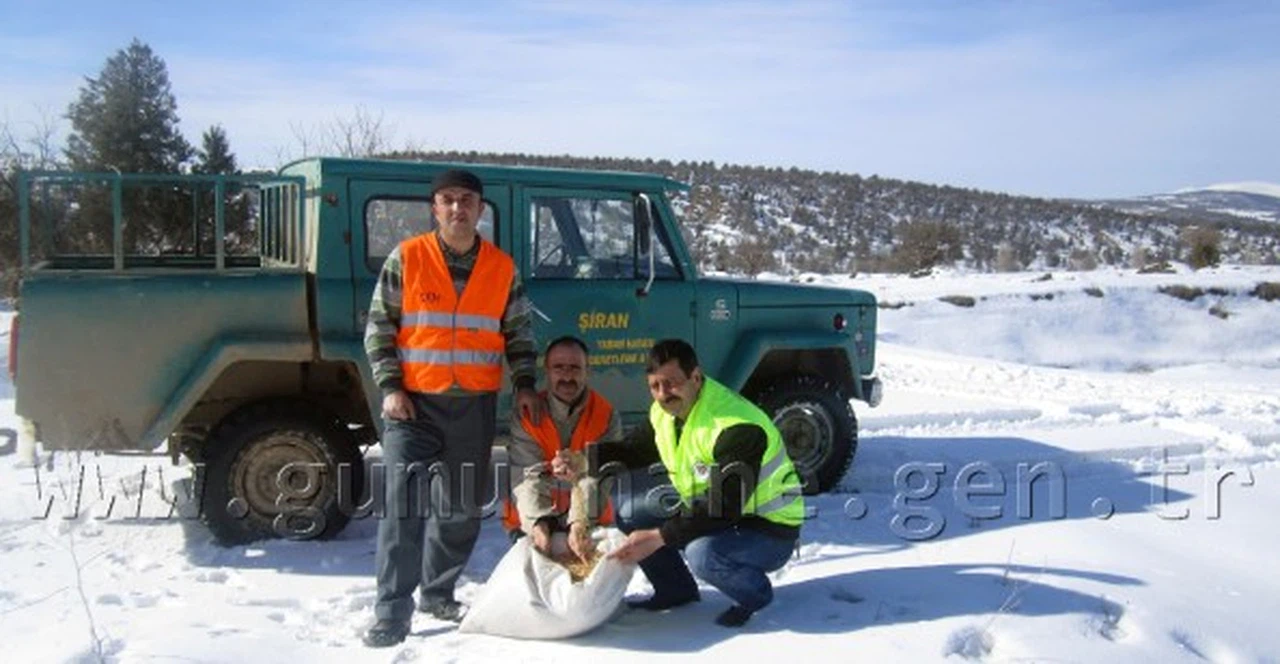 Şiran Avcılar ve Yaban Hayatı Koruma Derneği Yönetim Kurulu üyeleri Ümit Özel, Elvan Gül, Fayık Mallı ve Adem Yeniçeri, zorlu yolculuklarının ardından kar örtüsü bulunmayan ağaç diplerine yemleri bırakarak yemleme çalışmalarına son verdi.