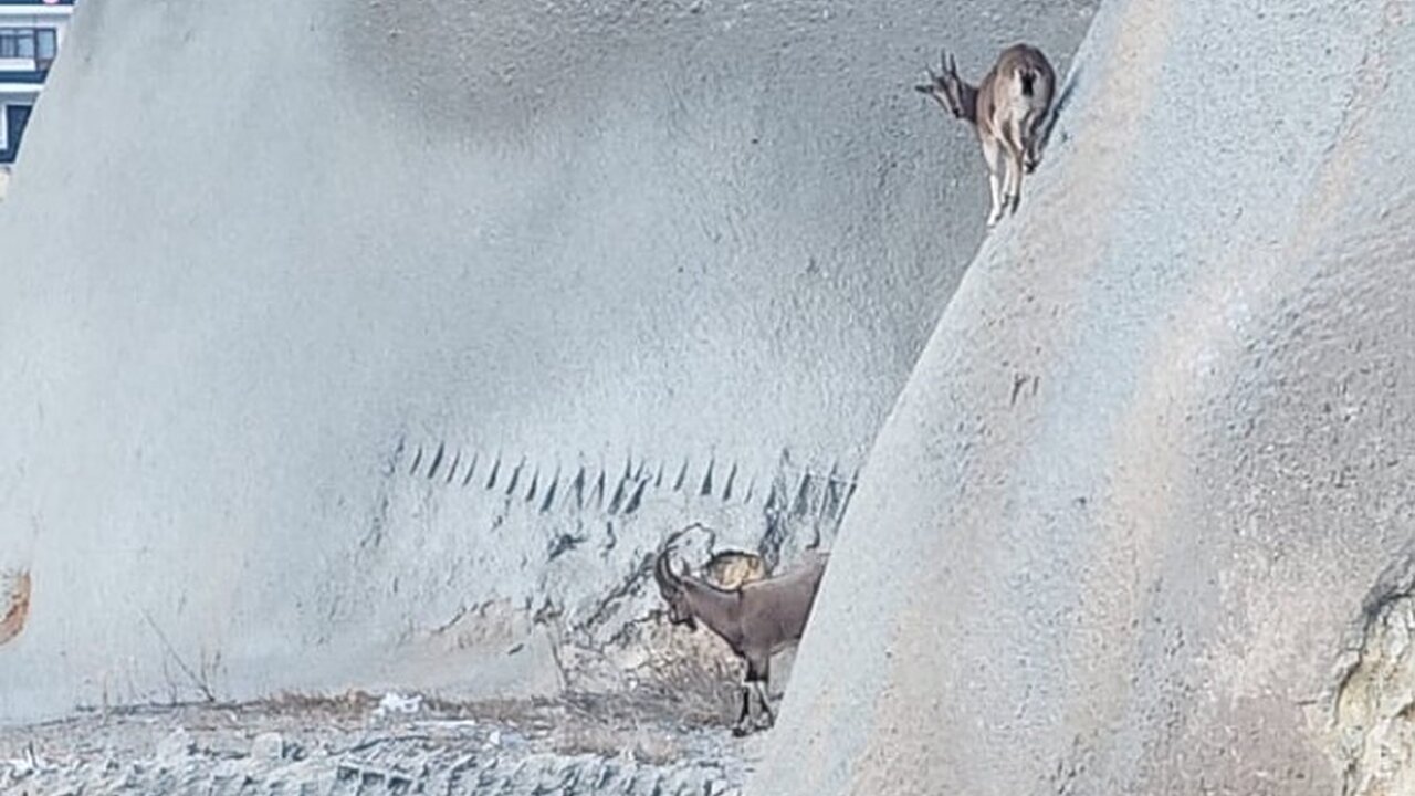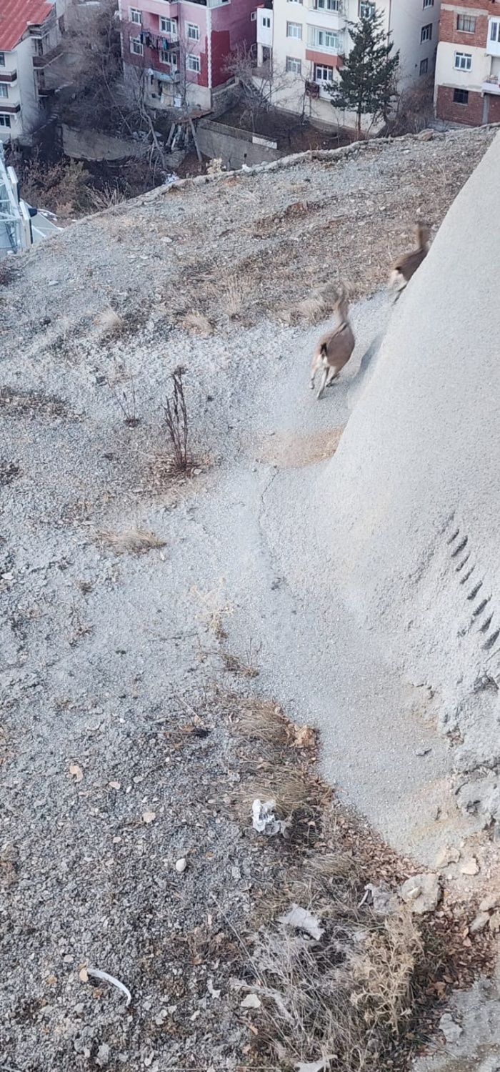 Çamlıca Mahallesi’nde yaban keçileri çevre yolu tünelleri üzerinde mahsur kaldı. Yiyecek aramak için dağlık alandan çevre yoluna kadar inen yetişkin ve genç yaban keçileri bir süre bölgede gezindikten sonra sokak köpekleriyle karşılaştı.