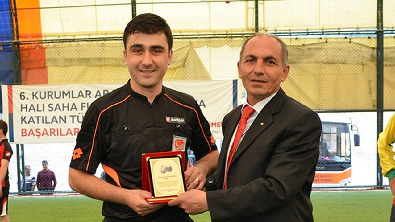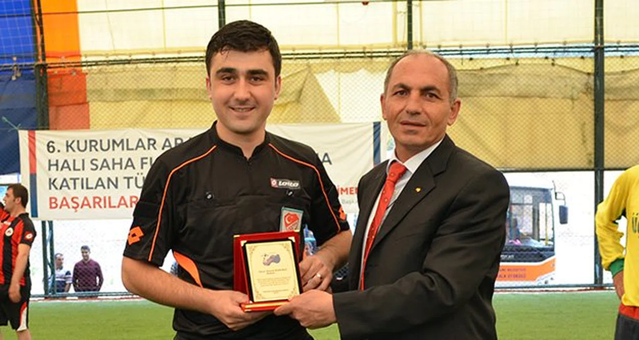 Geçtiğimiz günlerde gerçekleştirilen kurumlar arası halı saha turnuvası finalinin başlama vuruşunu yaptırarak hakemlik yaşantısını sonlandıran Korkmaz’a TFFHGD Gümüşhane Şubesi tarafından plaket takdim edildi.