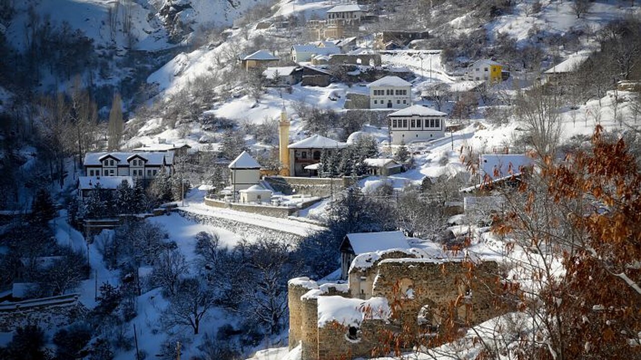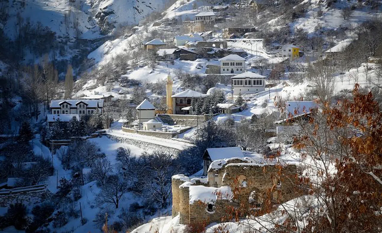 Gümüşhane’nin eski yerleşim yeri olan tarihi Süleymaniye Mahallesi kar yağışıyla birlikte beyaza büründü.