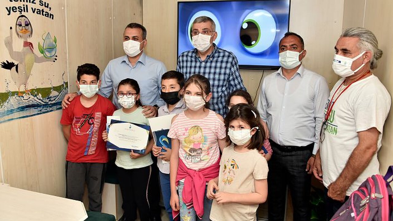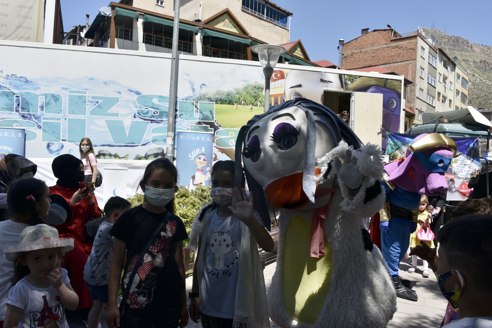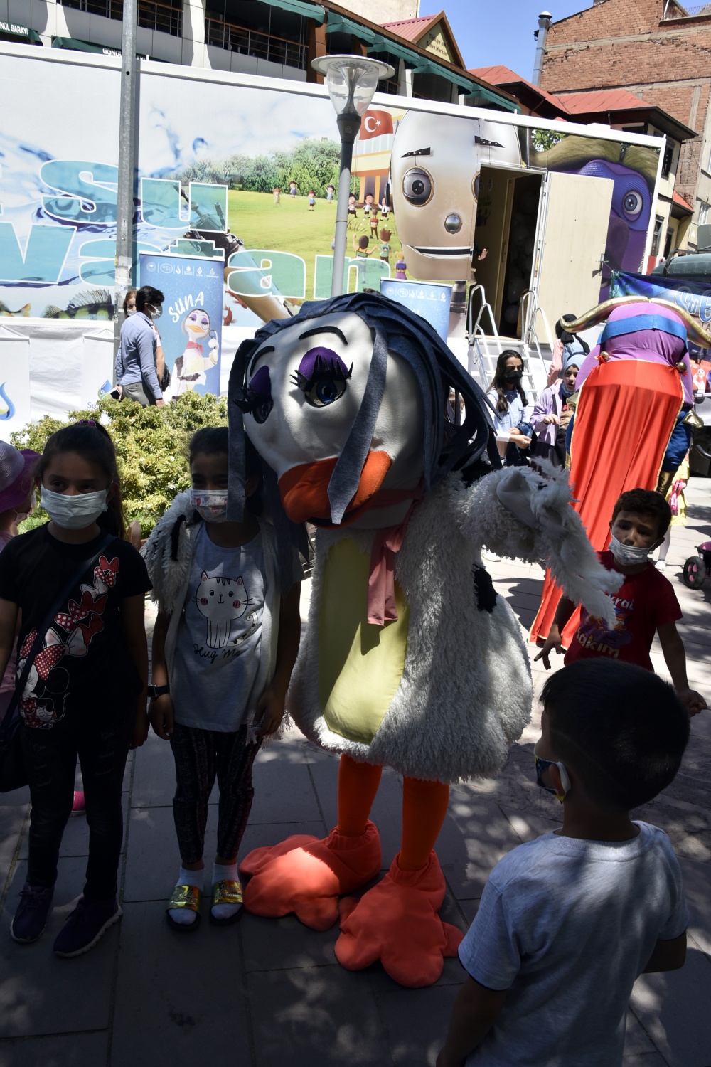 İçerisinde eğitici ekipmanların yer aldığı mobil eğitim tırı ve su elçileri kahramanlarının maskotlarının hazır olduğu programda çocuklar su elçileri maskotlarıyla eğlendi.