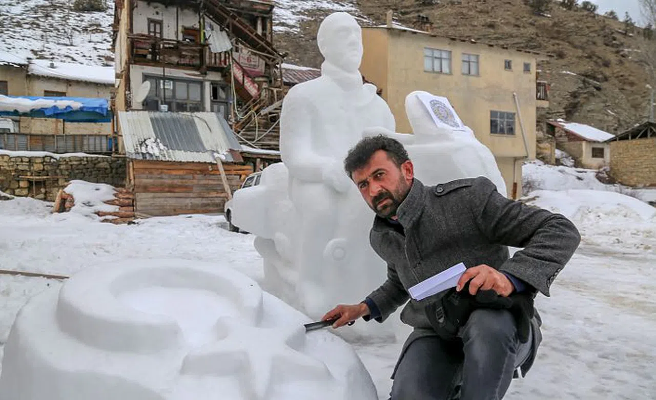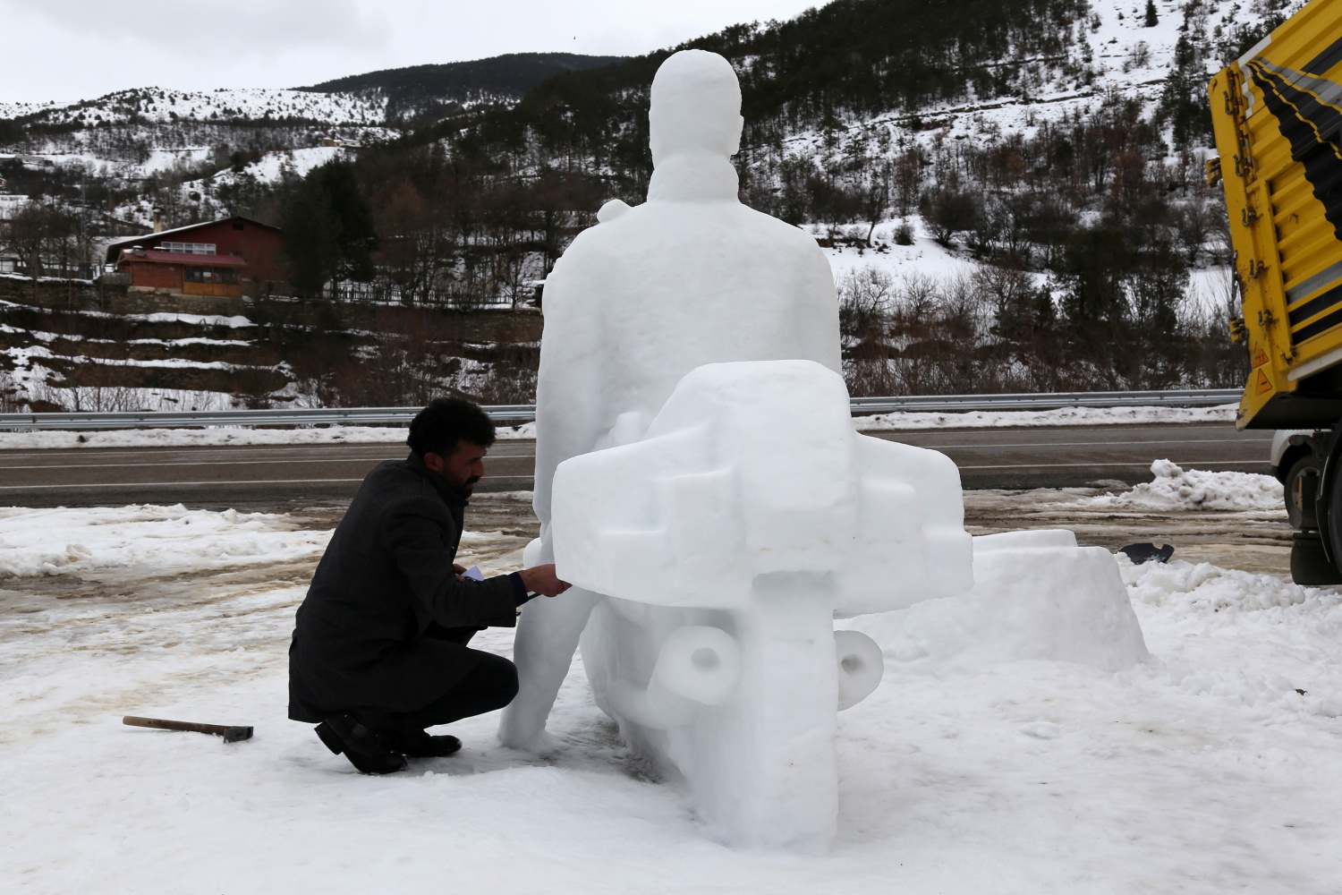 Torul ilçesine bağlı İnkılap köyünde yaşayan 38 yaşındaki Oral, yoğun kar yağışı nedeniyle işe gidemeyince önceki yıllarda olduğu gibi bu yıl da kardan heykel yapmaya karar verdi.