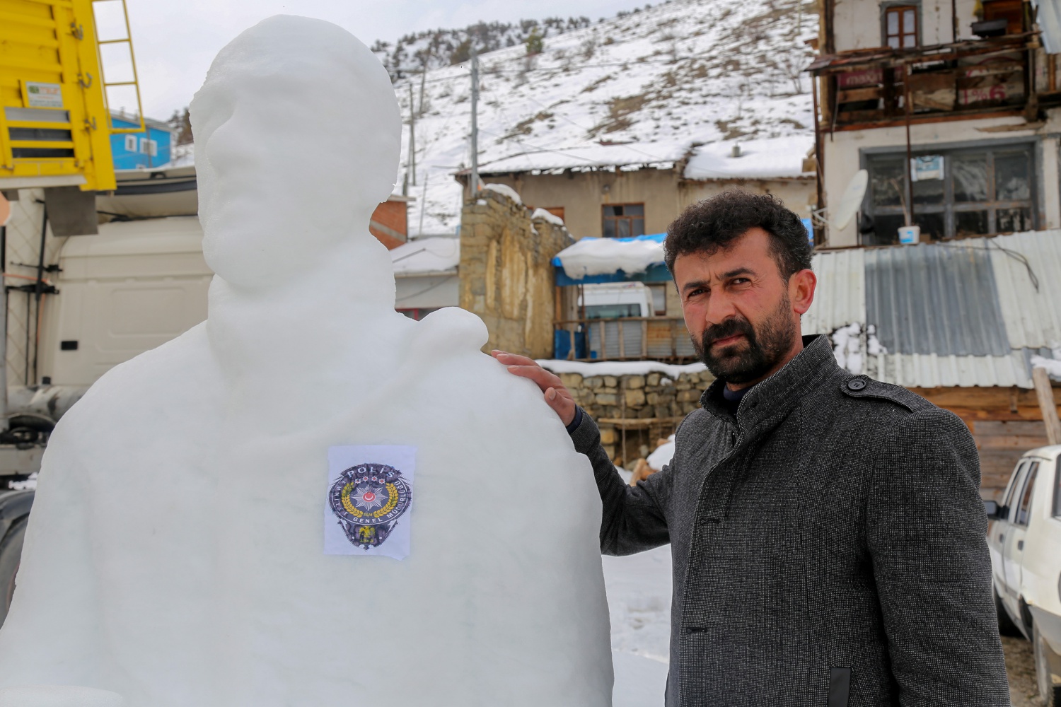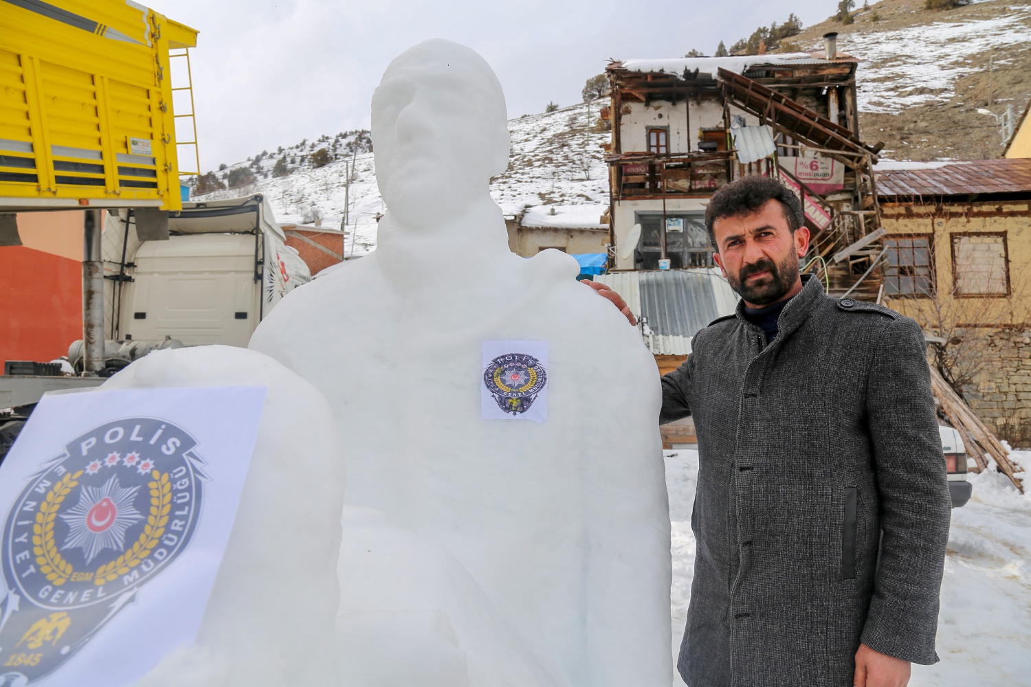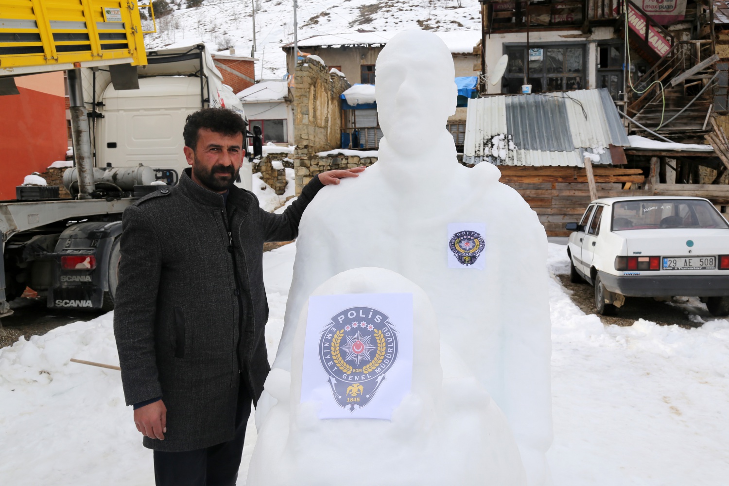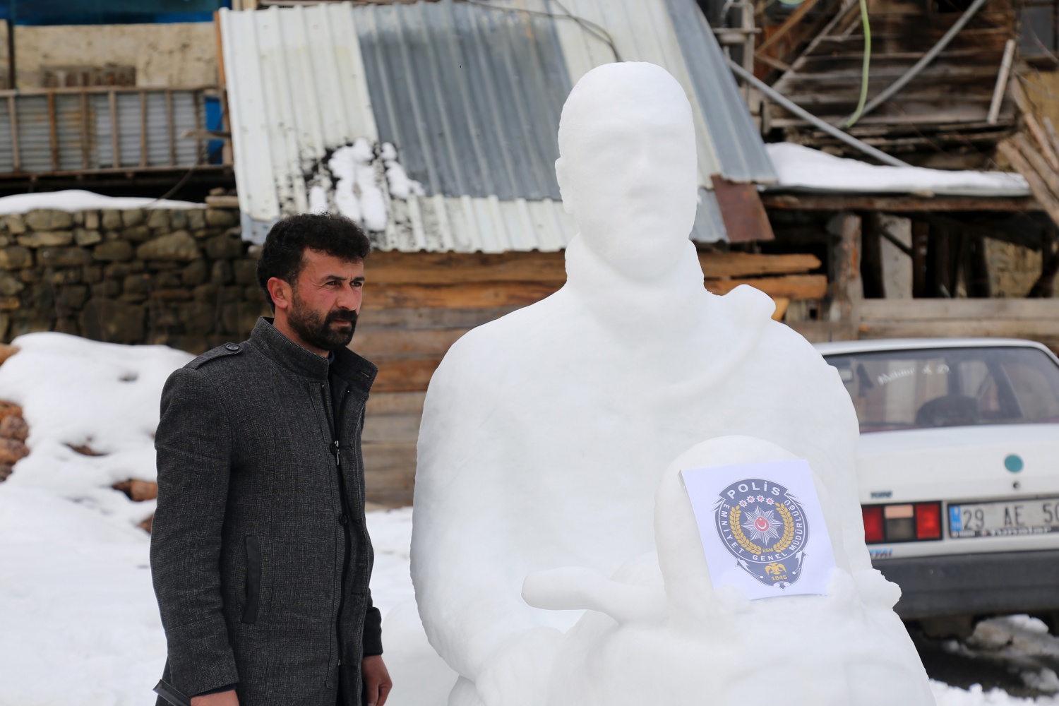 Gümüşhaneli tır şoförü Cihan Oral, İzmir adliyesi önünde terör örgütü mensuplarıyla kahramanca çarpışıp şehit olan polis memuru Fethi Sekin’in kardan heykelini yaptı.