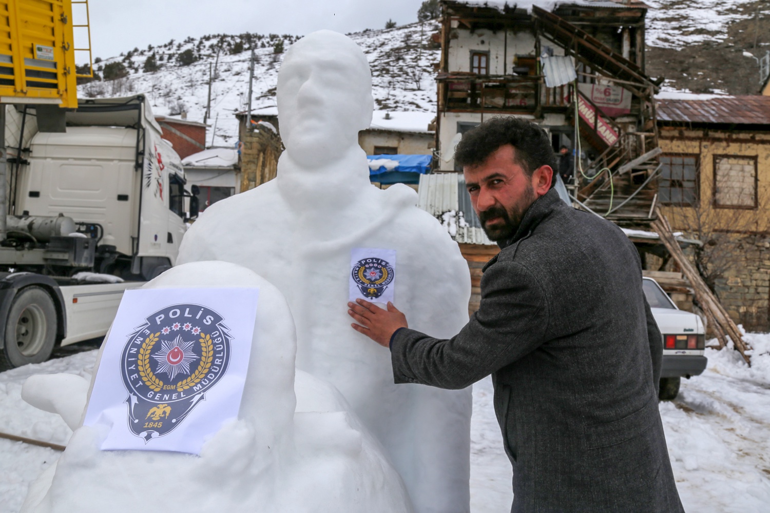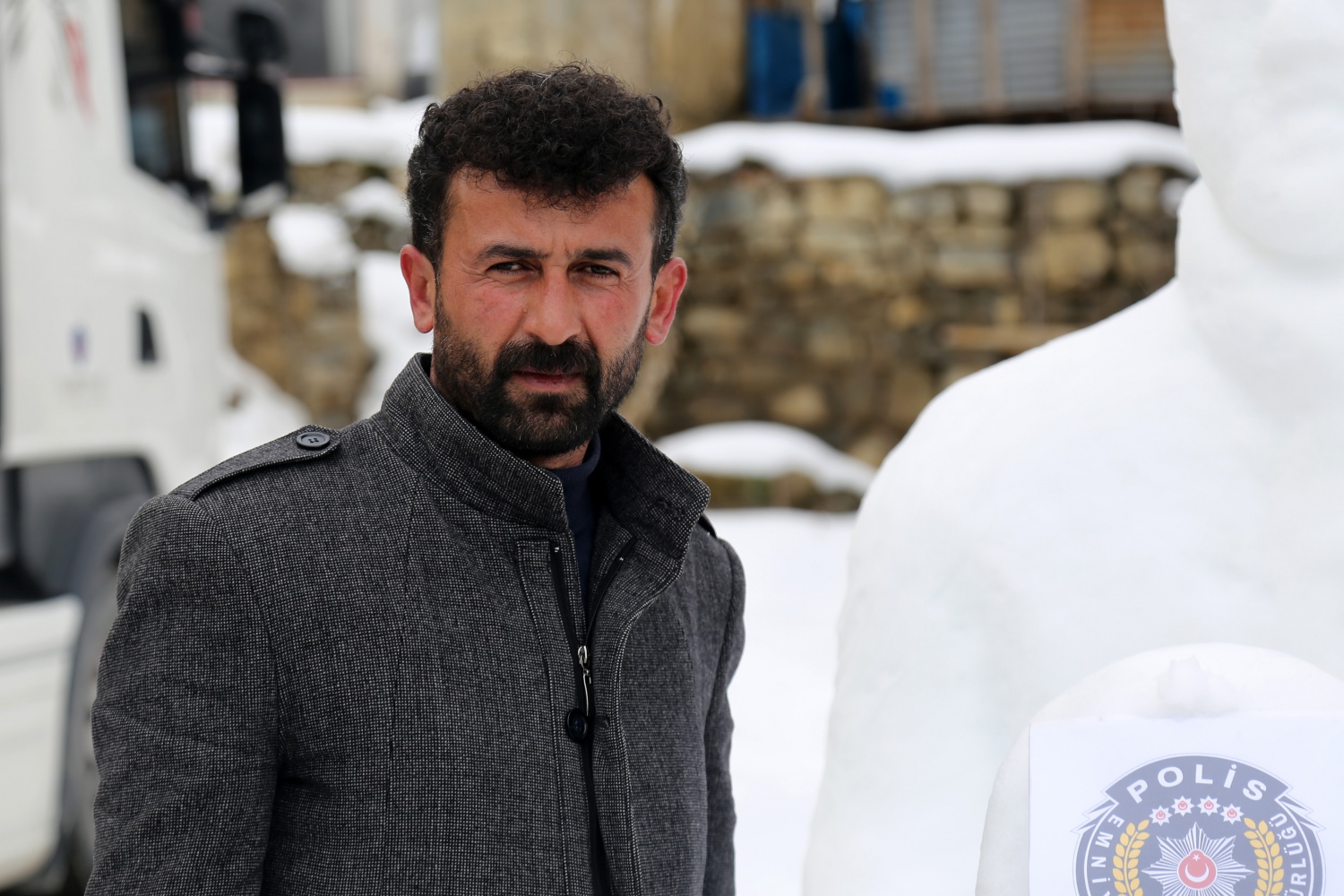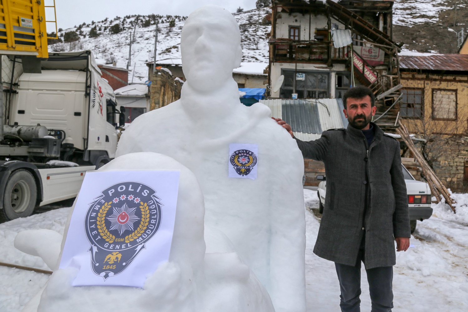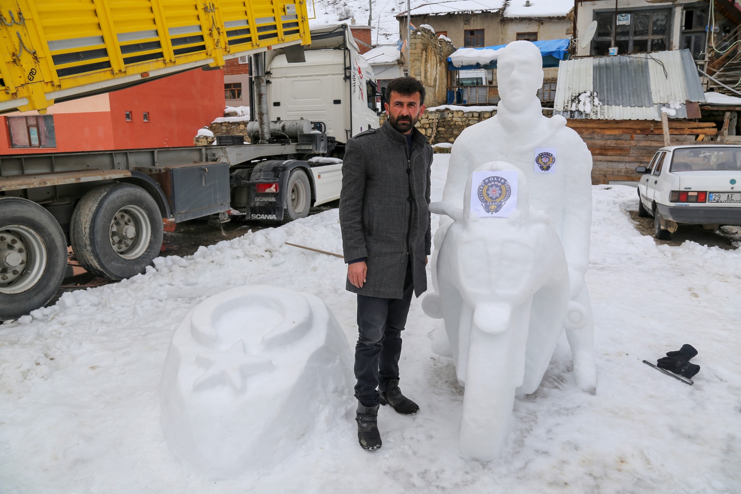 Gümüşhaneli tır şoförü Cihan Oral, İzmir adliyesi önünde terör örgütü mensuplarıyla kahramanca çarpışıp şehit olan polis memuru Fethi Sekin’in kardan heykelini yaptı.