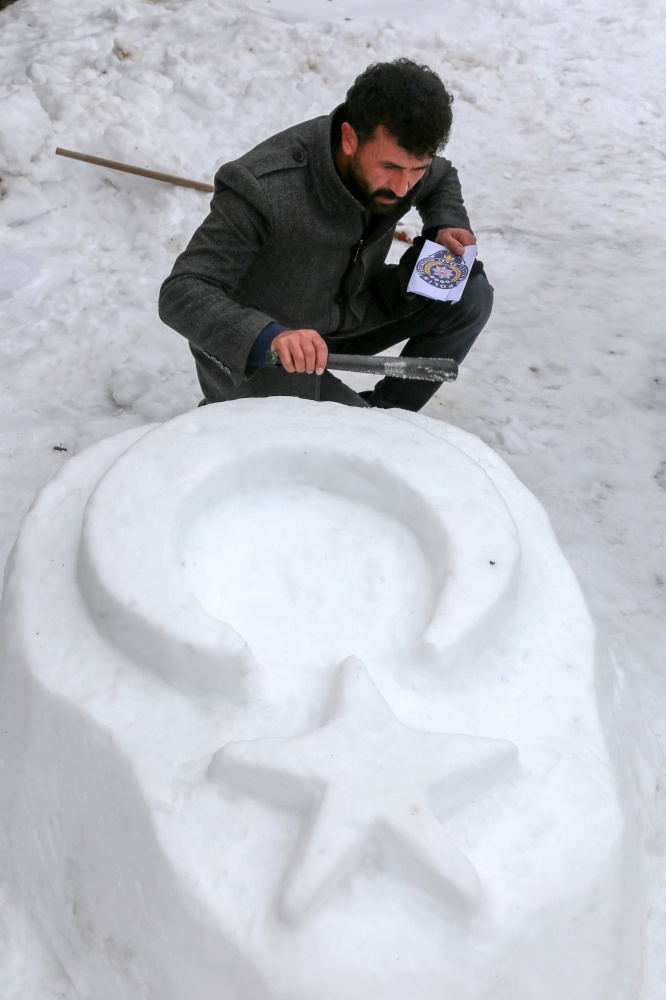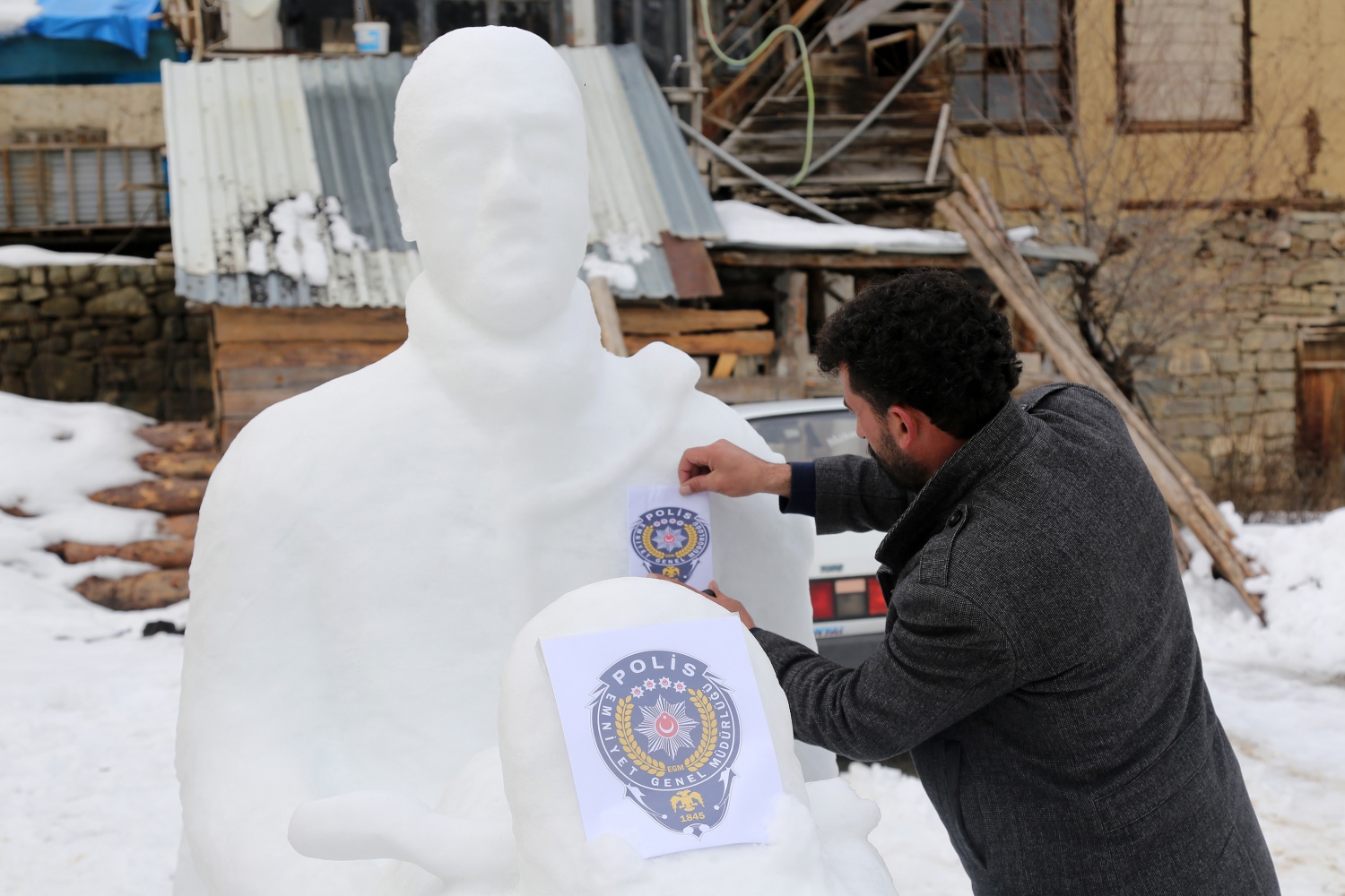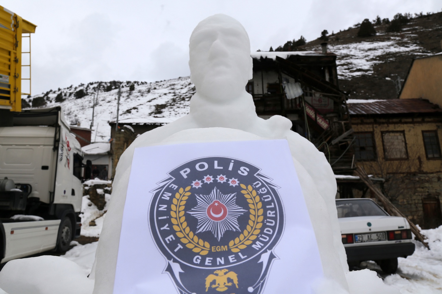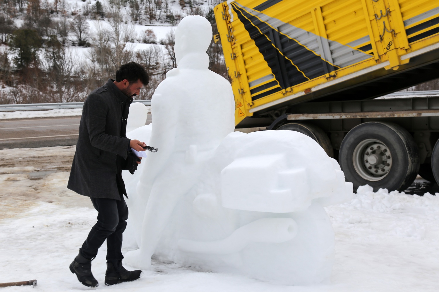 Gümüşhaneli tır şoförü Cihan Oral, İzmir adliyesi önünde terör örgütü mensuplarıyla kahramanca çarpışıp şehit olan polis memuru Fethi Sekin’in kardan heykelini yaptı.