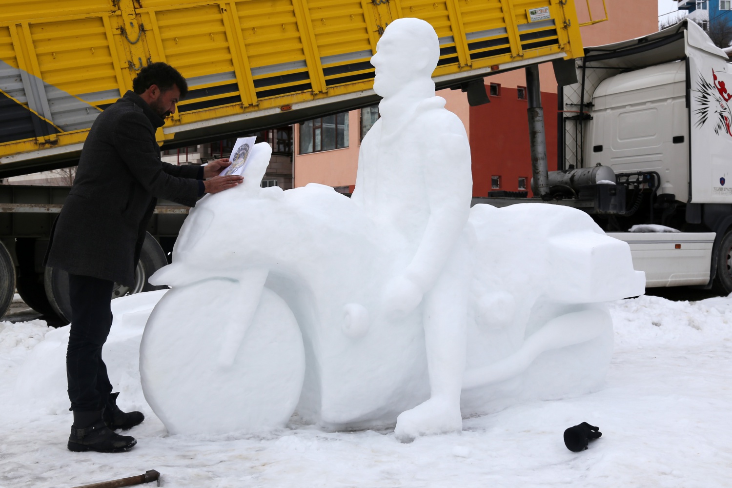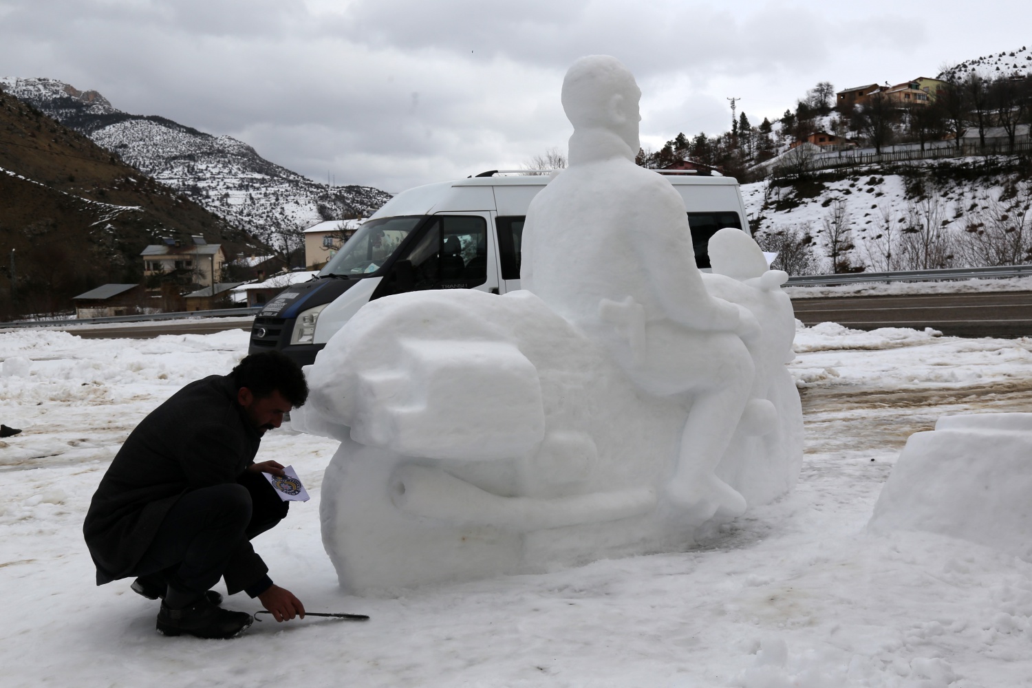 Şehit Sekin’i motosikleti üzerinde canlandıran Oral, hemen bitişiğinde de ay-yıldız figürü yaptı. İnkılap köyü camii önüyle İkisu-Şiran karayolu kenarındaki alanda karları toplayan Oral, kaba işlerini kürekle hallettiği heykelin ince işçiliğini de ayakkabı çekeceği olan “kerata” ile yaptı.