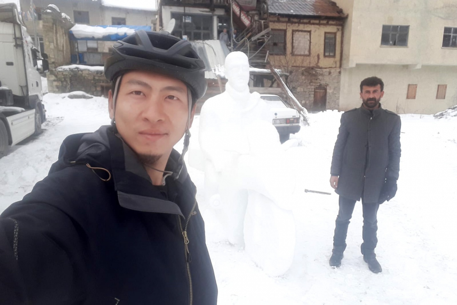 Heykelin köylülerin ve yoldan geçenlerin dikkatini çektiğini ifade eden Oral, “Yoldan geri dönüp bakan, fotoğraf çektirenler var. Malatya’dan gelen bir arkadaş kartını bile verdi. Malatya’ya gelince uğra dedi. Bisikletiyle yoldan geçen Çinli bir arkadaş da uğradı fotoğraf çektirdik, memnun oldu” dedi.