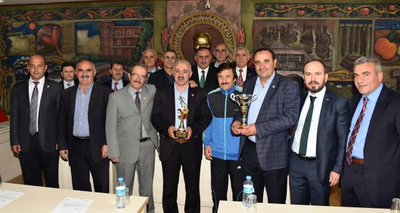 İstanbul 36. Avrasya Maratonunda kendi yaş grubunda birinci olan Gümüşhane İl Genel Meclisi üyesi 60 yaşındaki maratoncu İsmail Tozlu, toplantıya kupasıyla geldi.