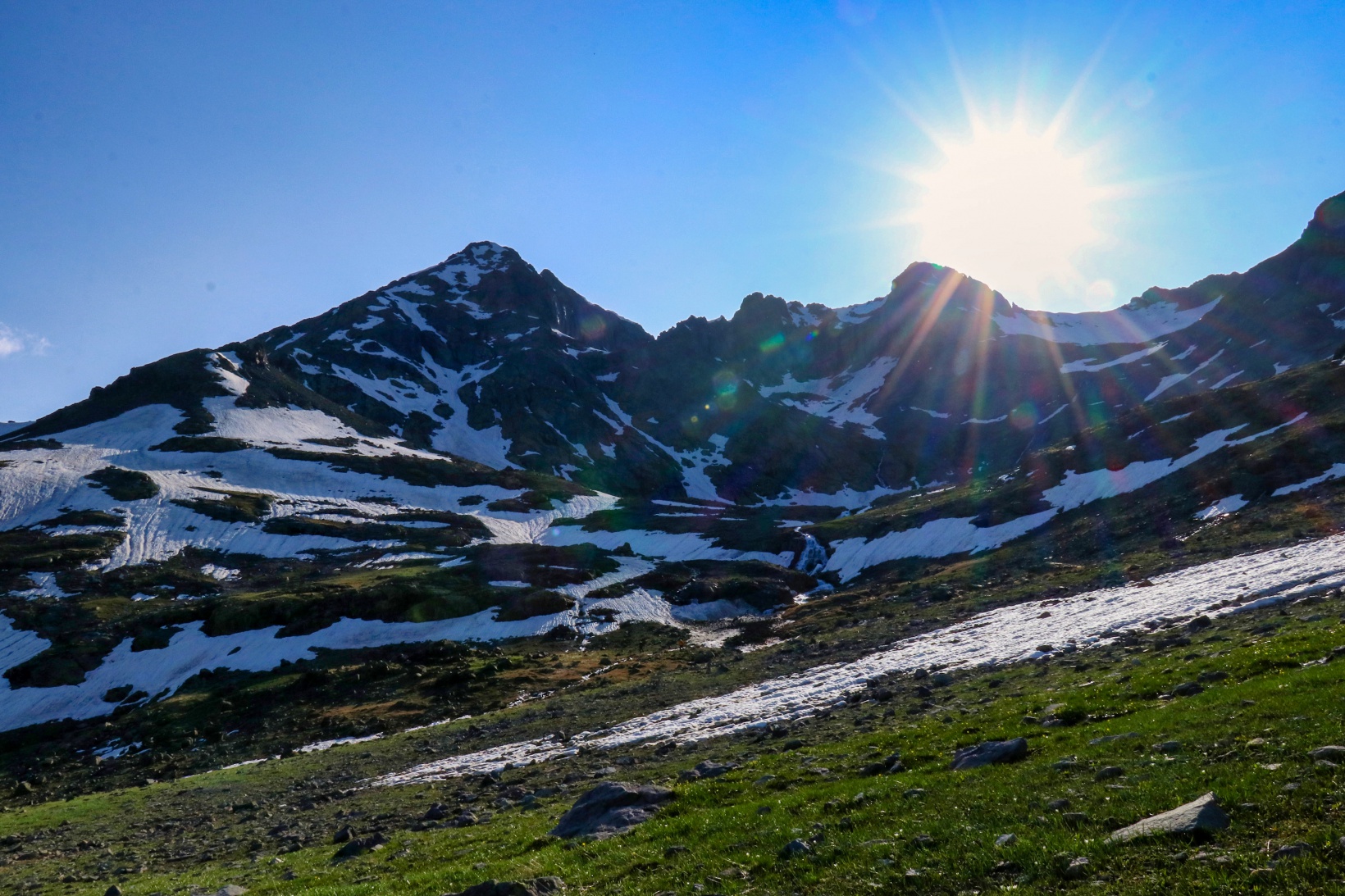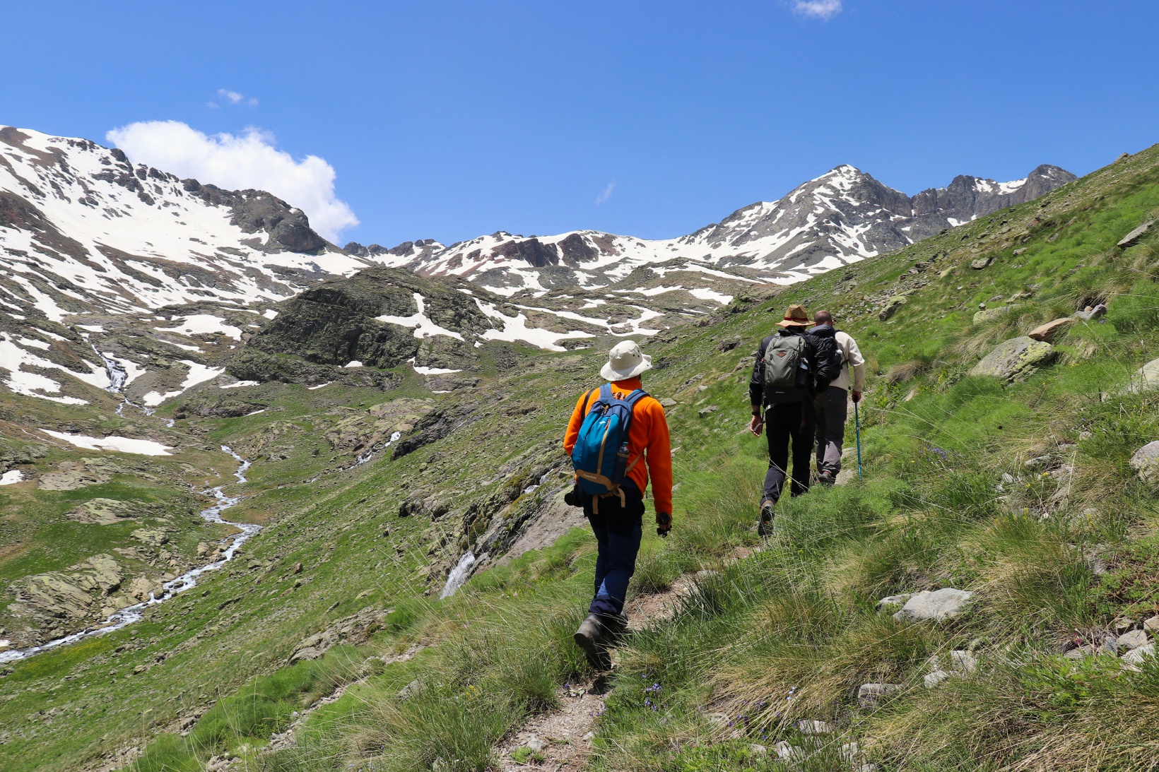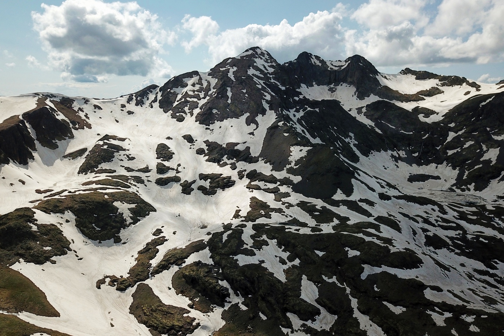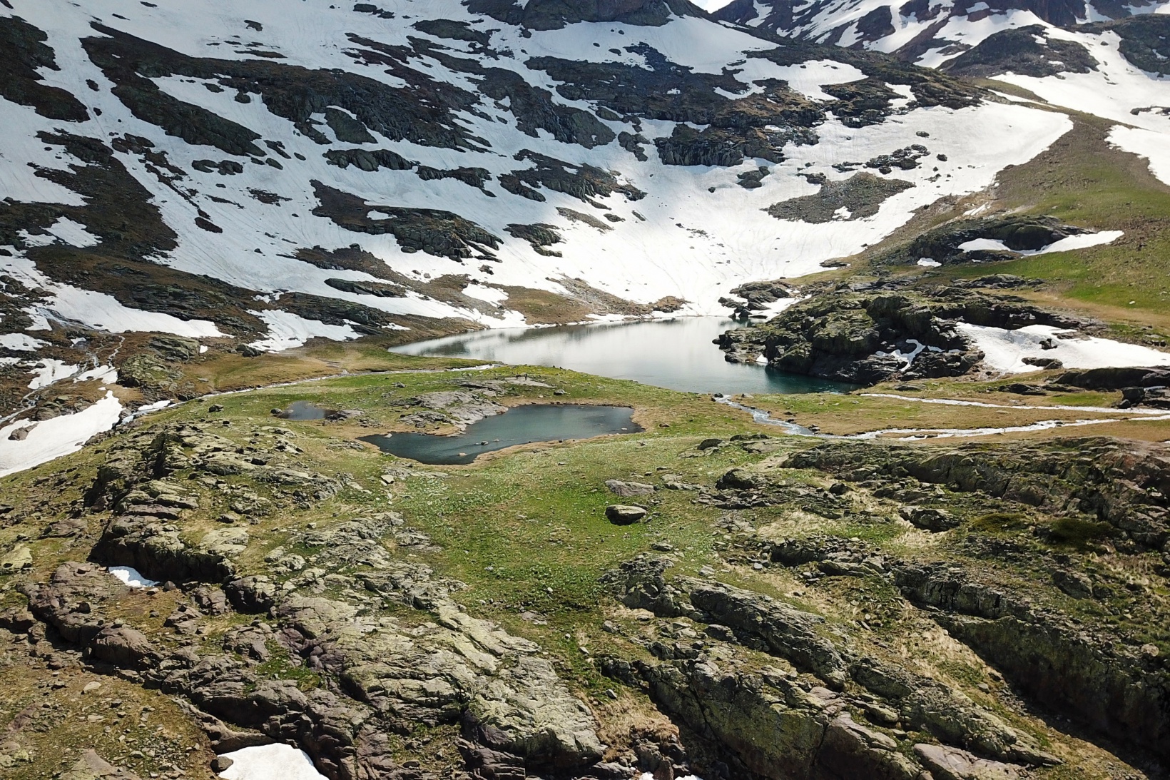2 bin 720 metre rakımdaki Büyük Gölden sonra yoğun kar örtüsü üzerinden yürüyerek 2 bin 890 metre rakımdaki Adalı Göle geçen ekip yol üzerinde yanlarındaki poşetin üzerine oturup haziran ayının son günlerinde kar üzerinde kaydı.