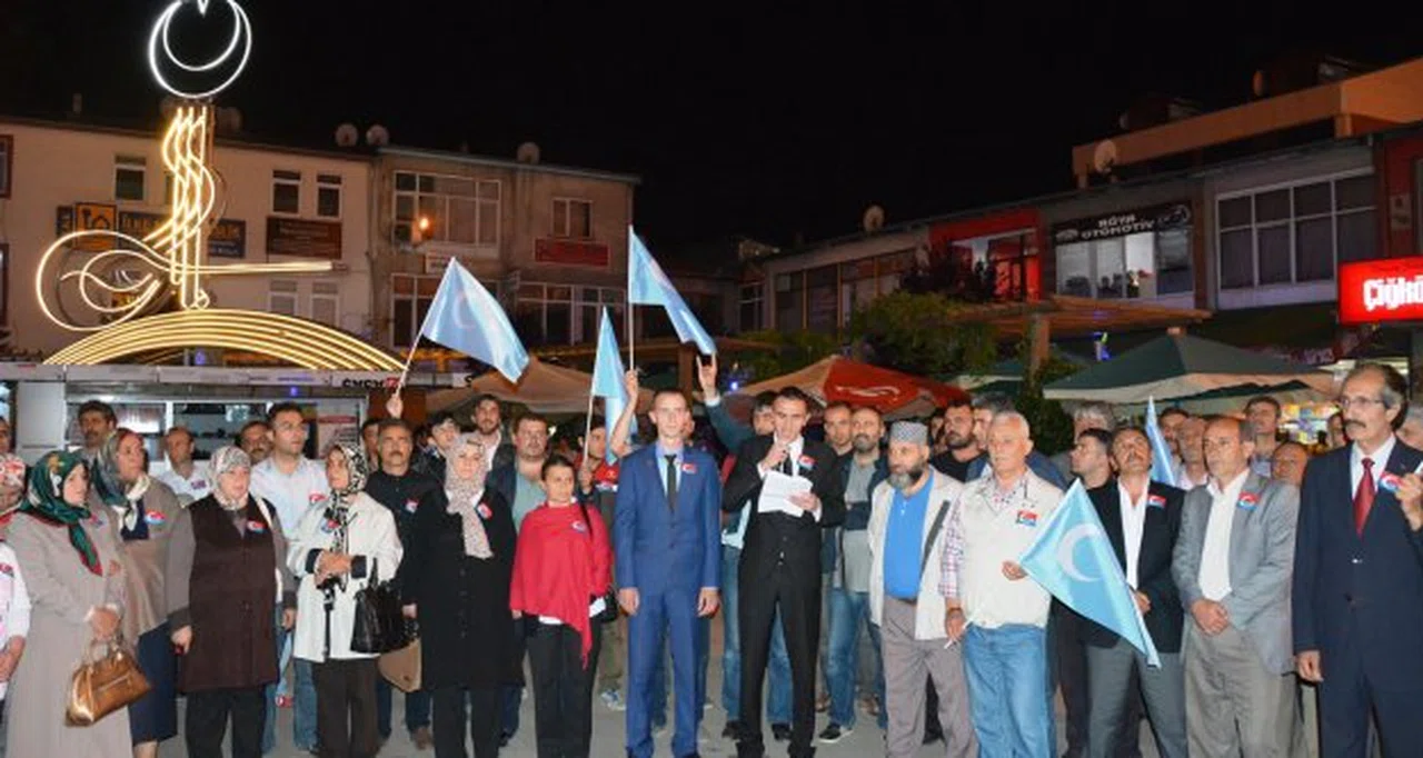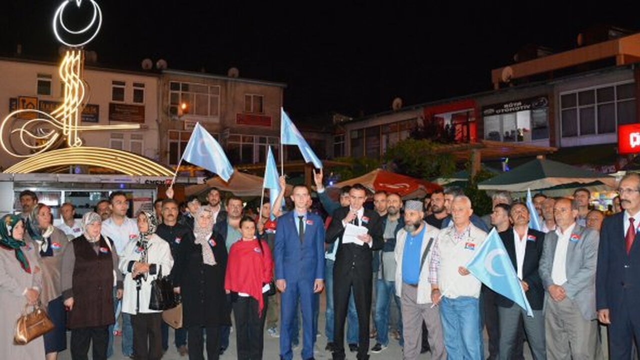 Teravih namazı sonrasında Fatih Parkı önünden Zafer Meydanına kadar yürüyen yaklaşık 70 kişilik grup ellerinde Türk ve Doğu Türkistan bayrakları taşıdı.
