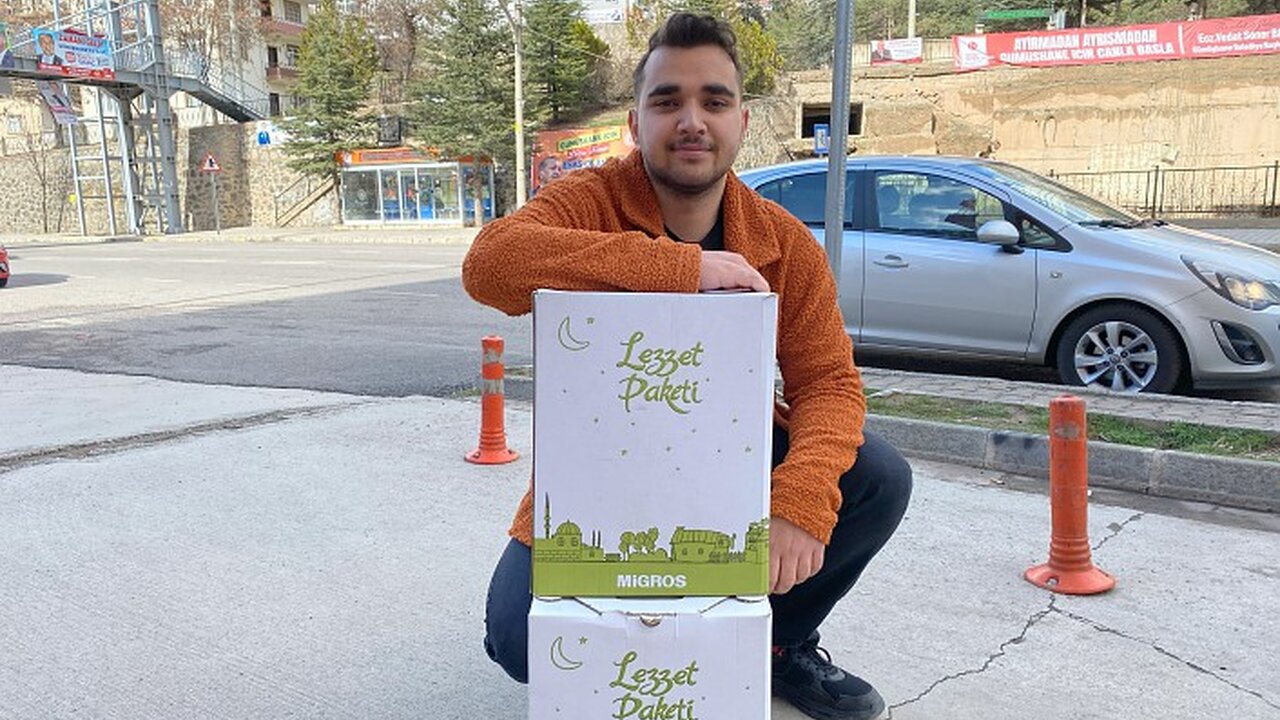 Gümüşhane Meslek Yüksekokulu Grafik Tasarımı 2. Sınıf öğrencisi Mert Arslan (19), maddi durumu iyi olmayan ailelere mübarek Ramazan ayında gıda kolisi yardımında bulundu.