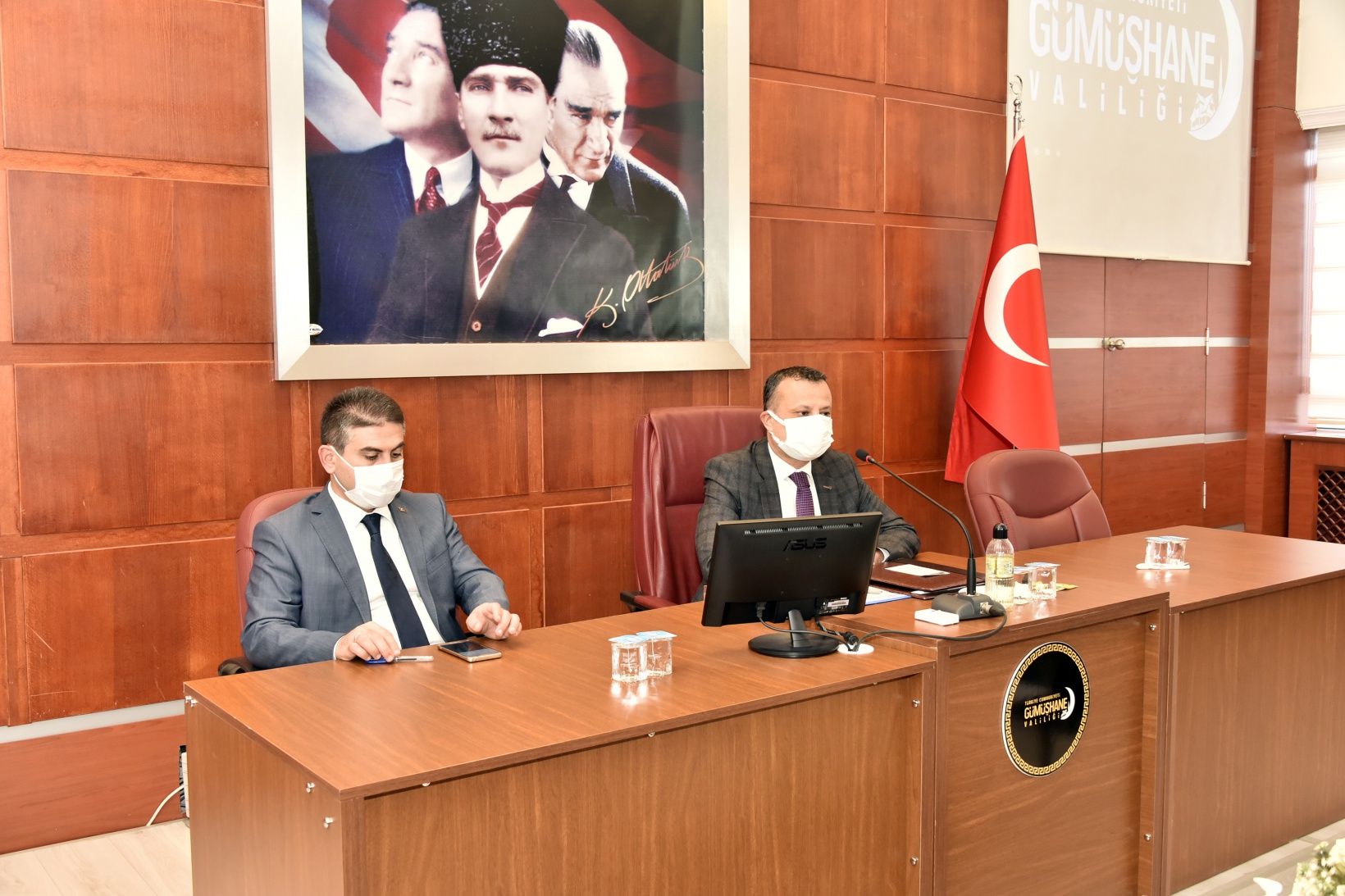 Gümüşhane’de Vali Kamuran Taşbilek başkanlığında Vali ¬Yardımcıları, İlçe Kaymakamları, İlçe ve Belde Belediye Başkanlarıyla Sağlık Müdürünün de katıldığı pandemi değerlendirme toplantısı yapıldı.