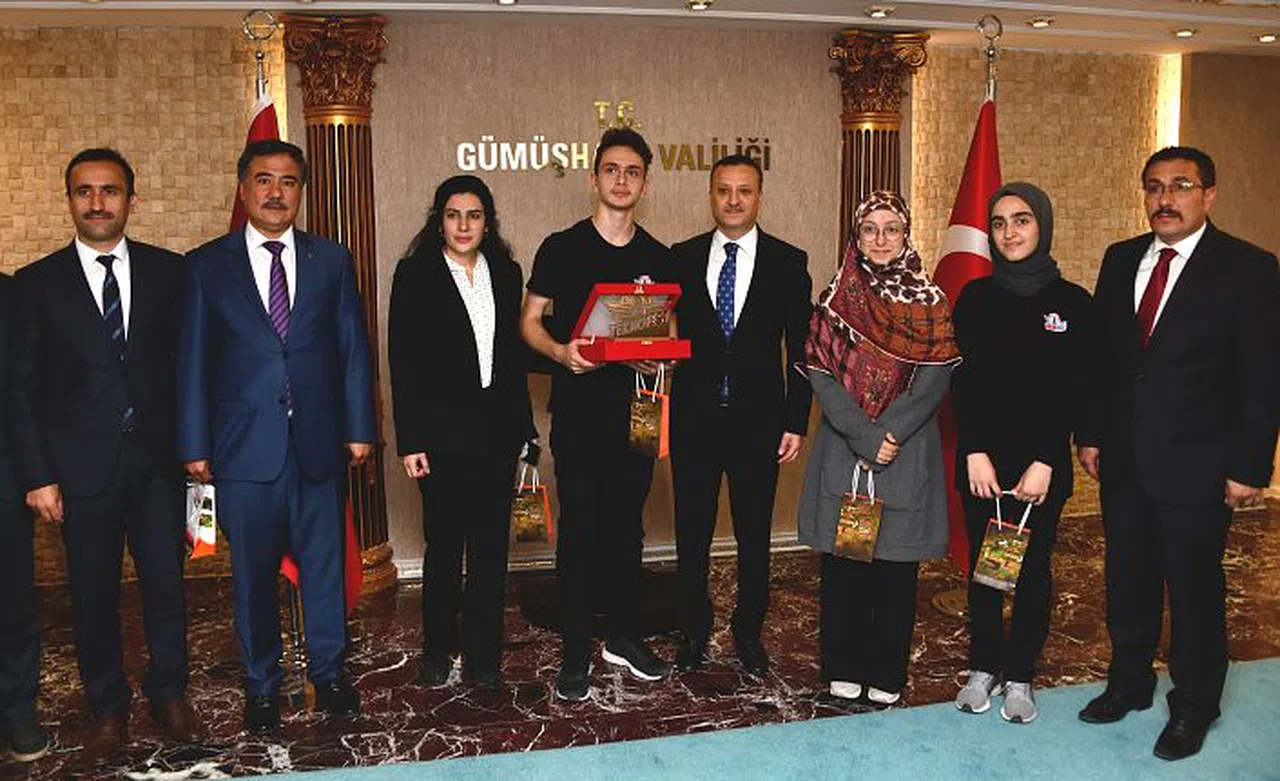 Gümüşhane Valisi Kamuran Taşbilek, TEKNOFEST İstanbul Havacılık, Uzay ve Teknoloji Festivali'nde Sağlık kategorisinde Türkiye birincisi olan Gümüşhane Bilim ve Sanat Merkezi öğrencilerinden oluşan proje ekibini makamında kabul ederek çeşitli hediyeler verdi.