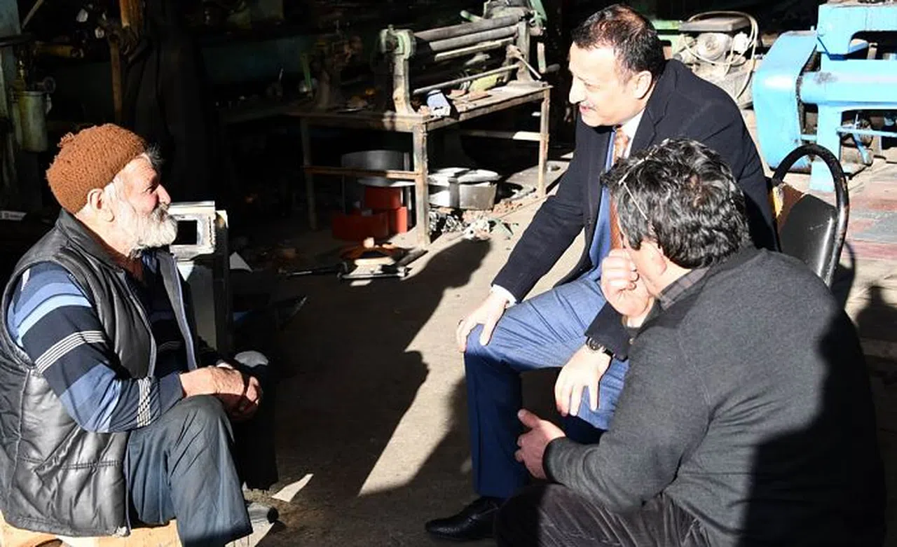 Vali Taşbilek, sanayi esnafı ziyareti kapsamında engeline rağmen 40 yıldır sanayi sitesinde esnaflık yapan torna ustası 69 yaşındaki Ethem Şevket Köprülü’yü de ziyaret ederek sohbet etti.