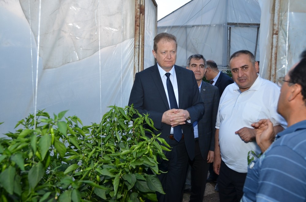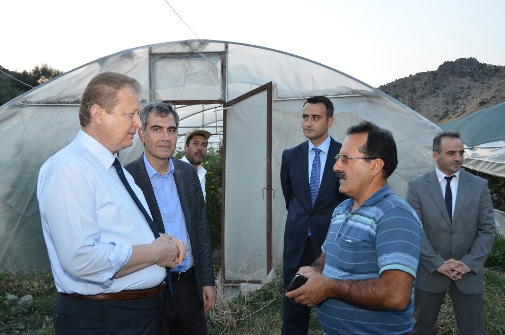 Kale Köyü dönüşünde yol kenarında bulunan sebze seralarını inceleyen Vali Yavuz, sera işletmecisi Adnan Coşkun ve çalışanlarıyla sohbet ederek, sera çalışmaları ve sebze yetiştiriciliği hakkında bilgi aldı.