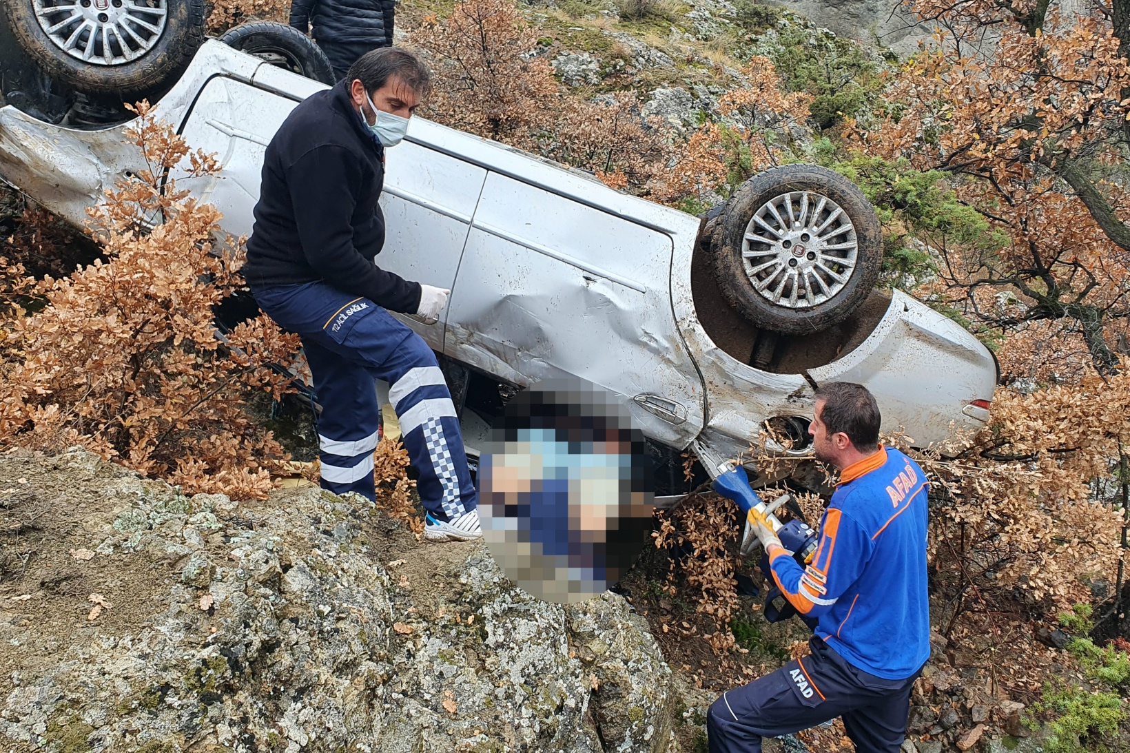 Yoldan yaklaşık 45 metrelik mesafede taklalar atan araç yamaçtaki ağaçlara takılınca durdu. Olayı gören vatandaşların ihbarı üzerine bölgeye çok sayıda 112 Acil Servis, AFAD ve Jandarma ekibi sevk edildi.