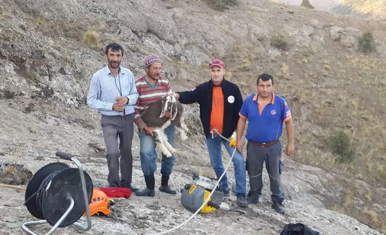 Çalışma sahasının zorluğu ve riski nedeniyle çalışanların tamamının bellerinden bağladıkları iple can güvenliğini sağladığı çalışmanın sonunda yavru keçi sahibine teslim edildi.