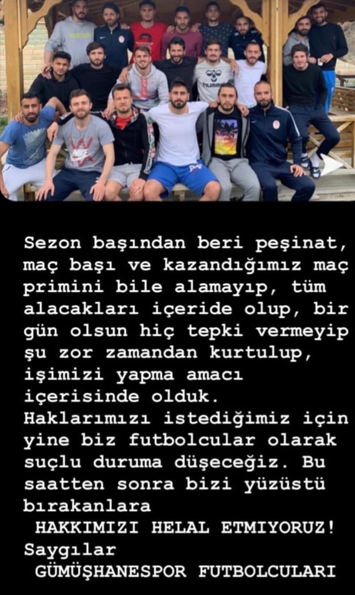 Öte yandan futbolcular müsabakanın ardından hep birlikte fotoğraf çektirerek “"Sezon başından beri peşinat, maç başı ve kazandığımız maç primini bile alamayıp, tüm alacakları içerde olup, bir gün olsun hiç tepki vermeyip şu zor zamandan kurtulup, işimizi yapma amacı içerisinde olduk. Halklarımızı istediğimiz için yine biz futbolcular olarak suçlu duruma düşeceğiz. Bu saatten sonra bizi yüzüstü bırakanlara hakkımızı helal etmiyoruz. Saygılar. Gümüşhanespor Futbolcuları” mesajını yazdı.