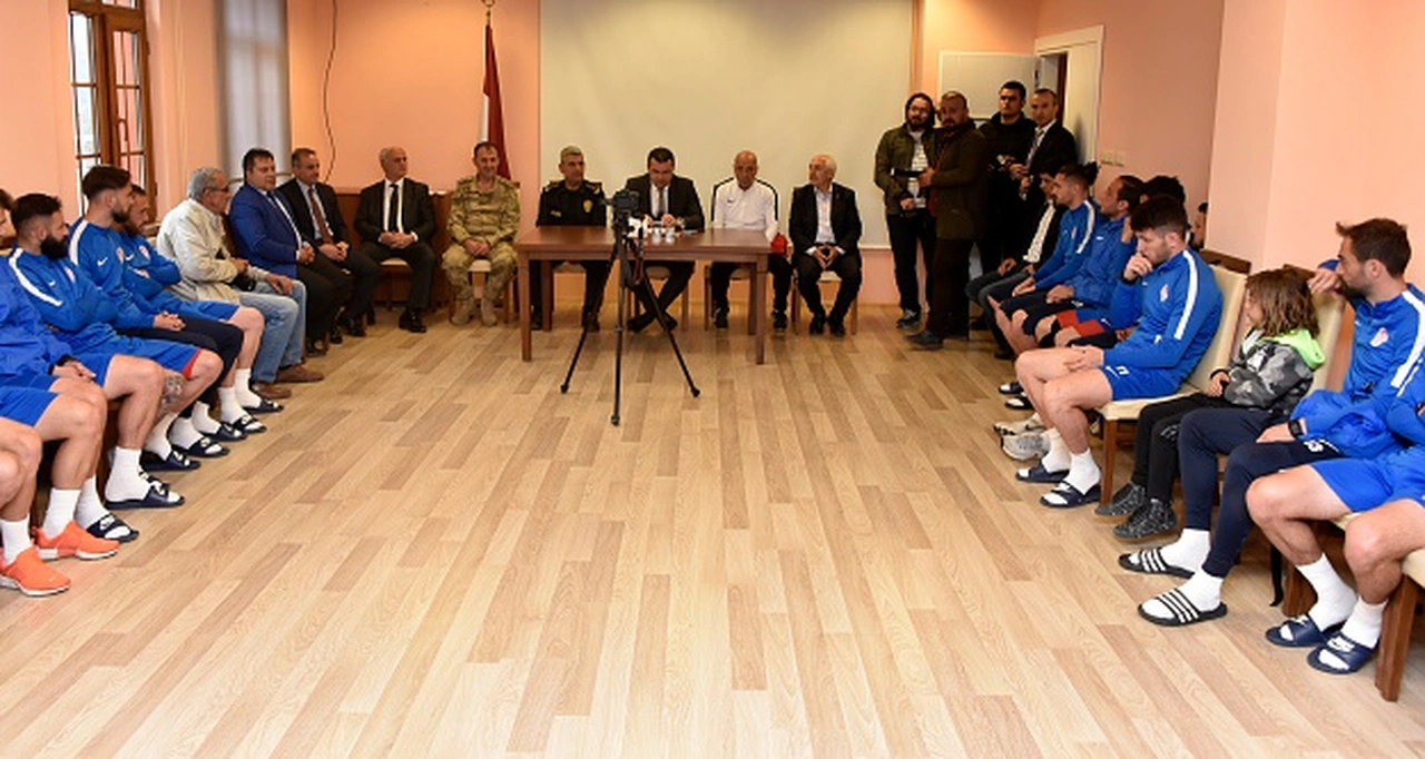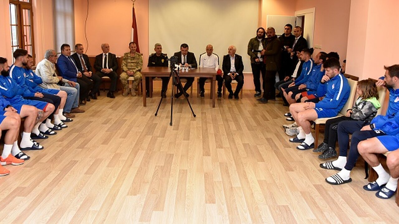 Beraberinde İl Jandarma Komutanı Albay Cezayir Danışan, İl Emniyet Müdürü Ömer Faruk Karataş, İl Özel İdaresi Genel Sekreteri Ekrem Akdoğan, Gençlik Hizmetleri ve Spor İl Müdürü İsrafil Aslan ve Gümüşhane Ticaret ve Sanayi Odası Başkanı İsmail Akçay’la birlikte futbolculara “Hepinizle tek tek gurur duyuyoruz” diye seslenen Vali Memiş, “Arkadaşlarımızla beraber sizlere olan sevgimizi, saygımızı göstermek istedik. Bizlere büyük bir mutluluk yaşattınız ve yaşatmaya devam ediyorsunuz. Hem maddi hem de manevi olarak yanınızda olduğumuzu bilmenizi istiyoruz” dedi.