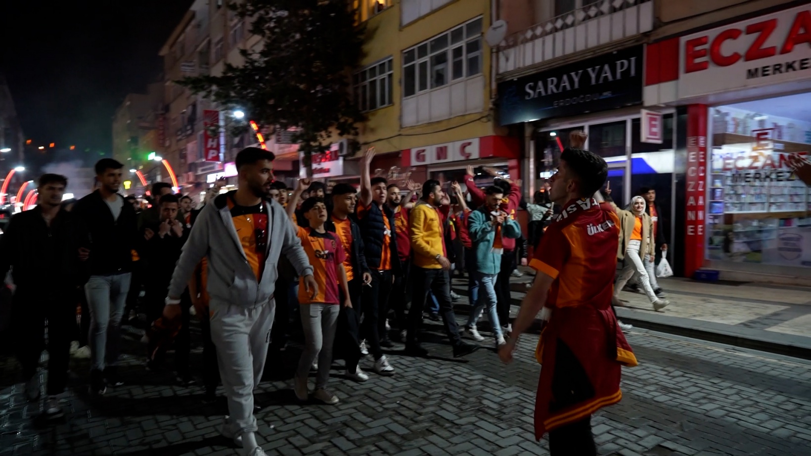 Gümüşhane’deki Galatasaray taraftarları da şampiyonluk sevincini doyasıya yaşadı. Maçın bitiş düdüğünün çalmasının ardından sokaklara dökülen taraftarlar, ellerinde bayraklar ve meşalelerle Atatürk Caddesi'nde kutlama yaptı.
