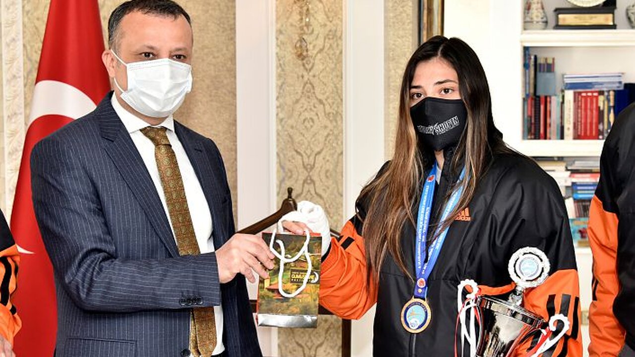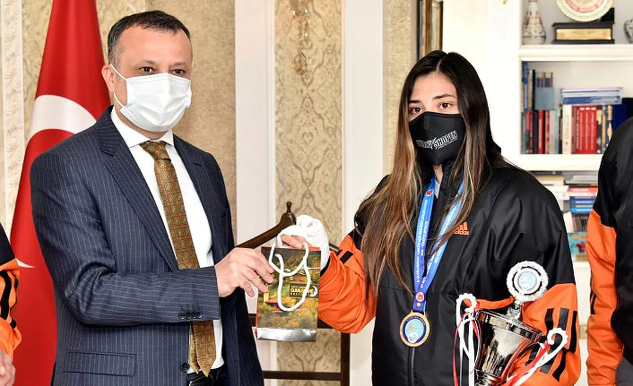 Gümüşhane Valisi Kamuran Taşbilek, Antalya’da düzenlenen 6. Uluslararası Türkiye Açık Kick Boks Avrupa Kupasında şampiyon olan Feyzanur Azizoğlu’nu makamında kabul ederek hediye takdim etti.
