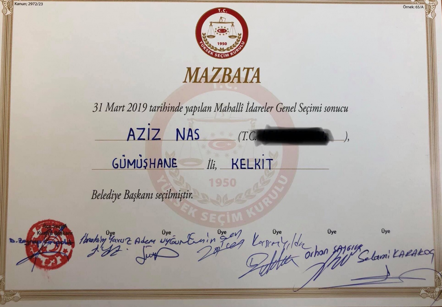 31 Mart’ta yapılan mahalli idareler genel seçimlerinde itiraz sürecinin sonlanmasının ardından Kelkit ilçesinde Aziz Nas, Kürtün ilçesine bağlı Özkürtün Beldesinde Yakup Turgut mazbatalarını alarak resmi olarak görevlerine başladı.