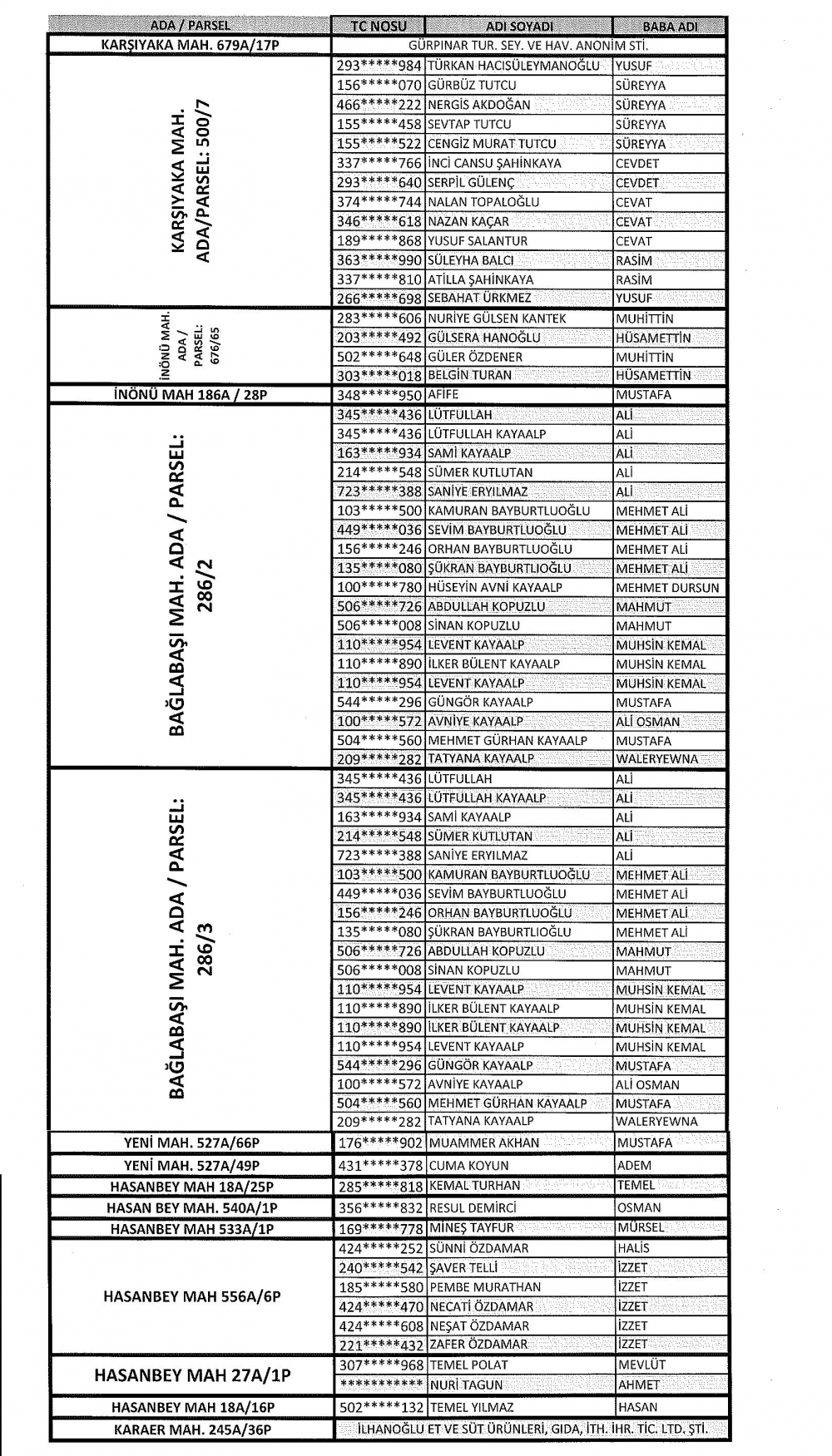 Listede Karşıyaka Mahallesi 500/7, Karşıyaka Mahallesi 679A/17P, İnönü Mahallesi 676/65, İnönü Mahallesi 186A/28P, Bağlarbaşı Mahallesi 286/2, Bağlarbaşı Mahallesi 286/3, Yeni Mahalle 527A/66P, Yeni Mahalle 527/A/49P, Hasanbey Mahallesi 18A/25P, Hasanbey Mahallesi 540A/1P, Hasanbey Mahallesi 533A/1P, Hasanbey Mahallesi 556A/6P, Hasanbey Mahallesi 27A/1P, Hasanbey Mahallesi 18A/16P ve Karaer Mahallesi 245A/36P ada parseldeki bina yer alıyor.