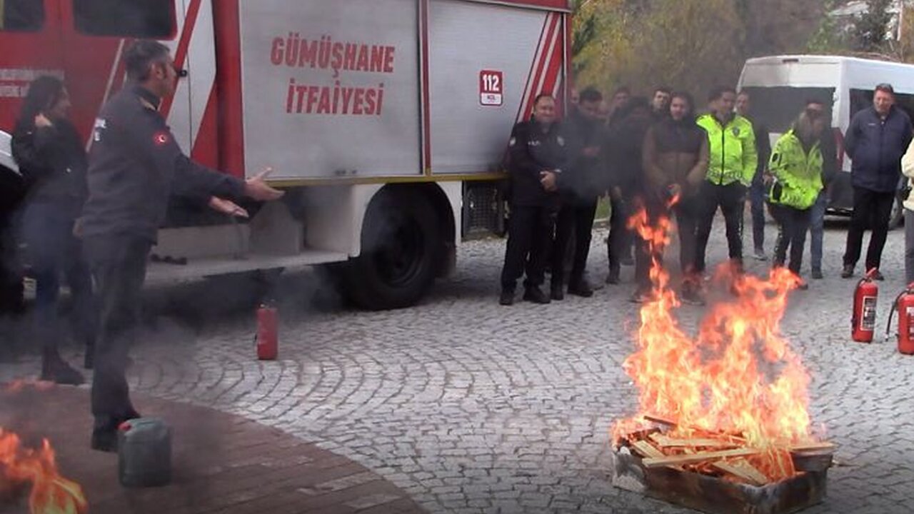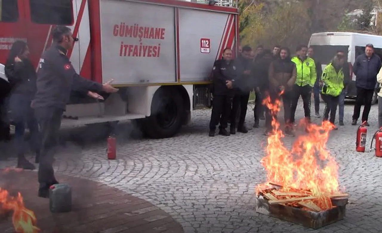 Teorik eğitimlerin ardından Gümüşhane Belediyesi İtfaiye Amiri Muhammet Aydın’ın öncülüğünde yangına müdahale ve sonrasında yapılacaklarla ilgili uygulama tatbikatı yapıldı.