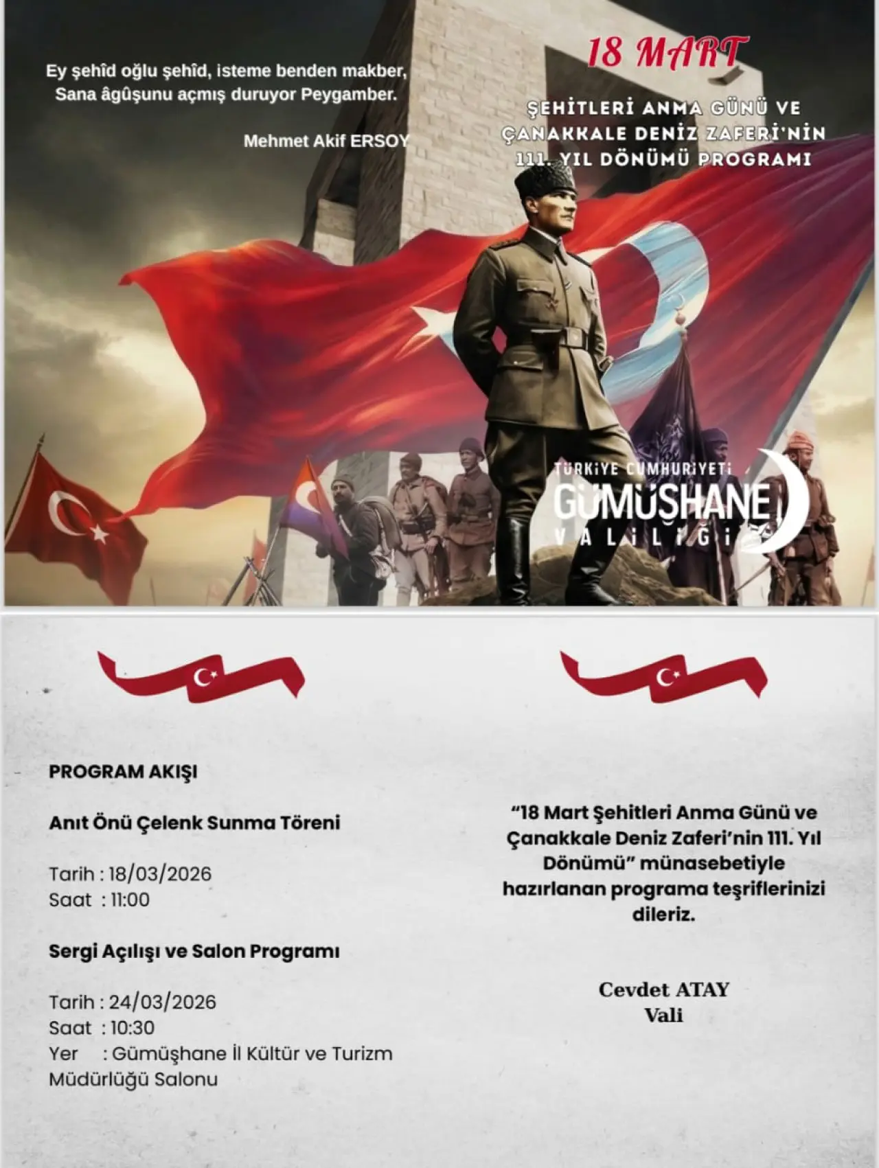 “Tarihe altın harflerle yazılan 18 Mart Çanakkale Zaferi’nin 111. Yıl dönümünü millet olarak kutlamanın sevincini ve kutsal vatanımız için canlarını feda eden şehitlerimizin Şehitler Günü’nü idrak etmenin onur ve gururunu yaşamaktayız.