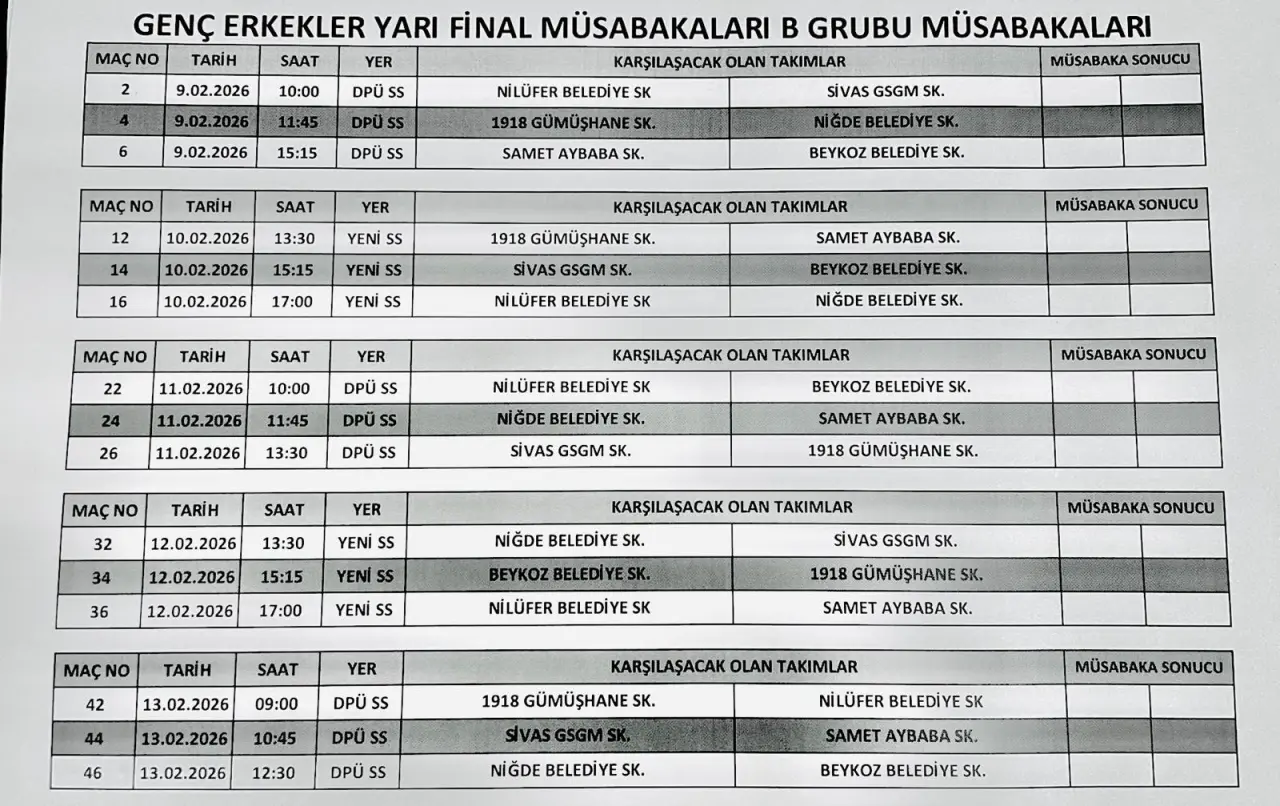 Türkiye genelinden 22 takımın katılımıyla 9-13 Şubat tarihleri arasında Kütahya’da düzenlenecek olan yarı final organizasyonu A, B, C ve D olmak üzere 4 gruptan oluşuyor.