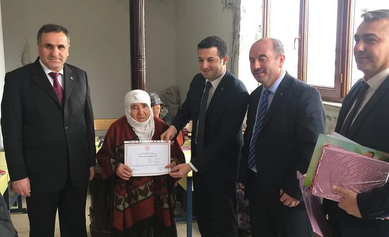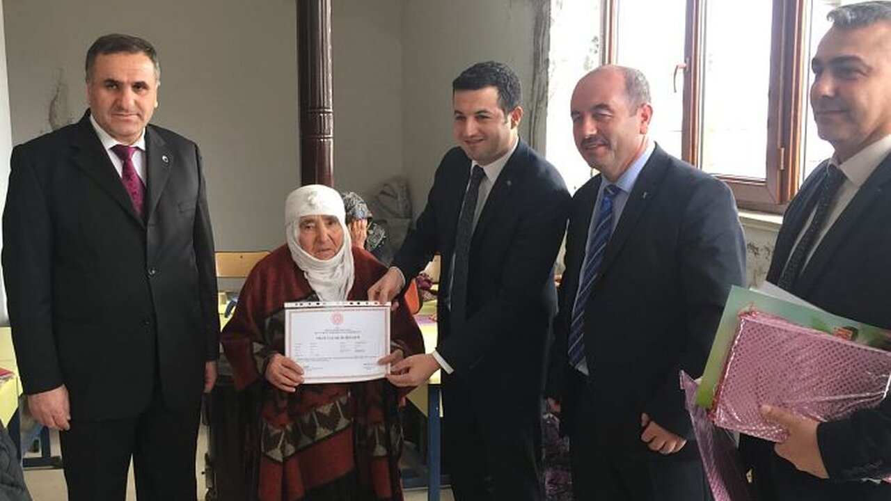 Gümüşhane’nin Şiran ilçesinde okuma yazma kursunu bitiren 85 yaşındaki Rabia Kılıç’a belgesini Kaymakam Osman Oğuz Ekşi verdi.