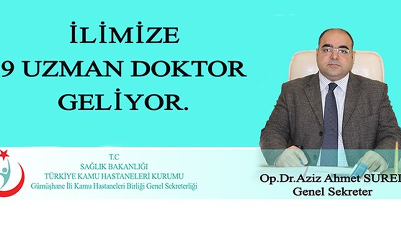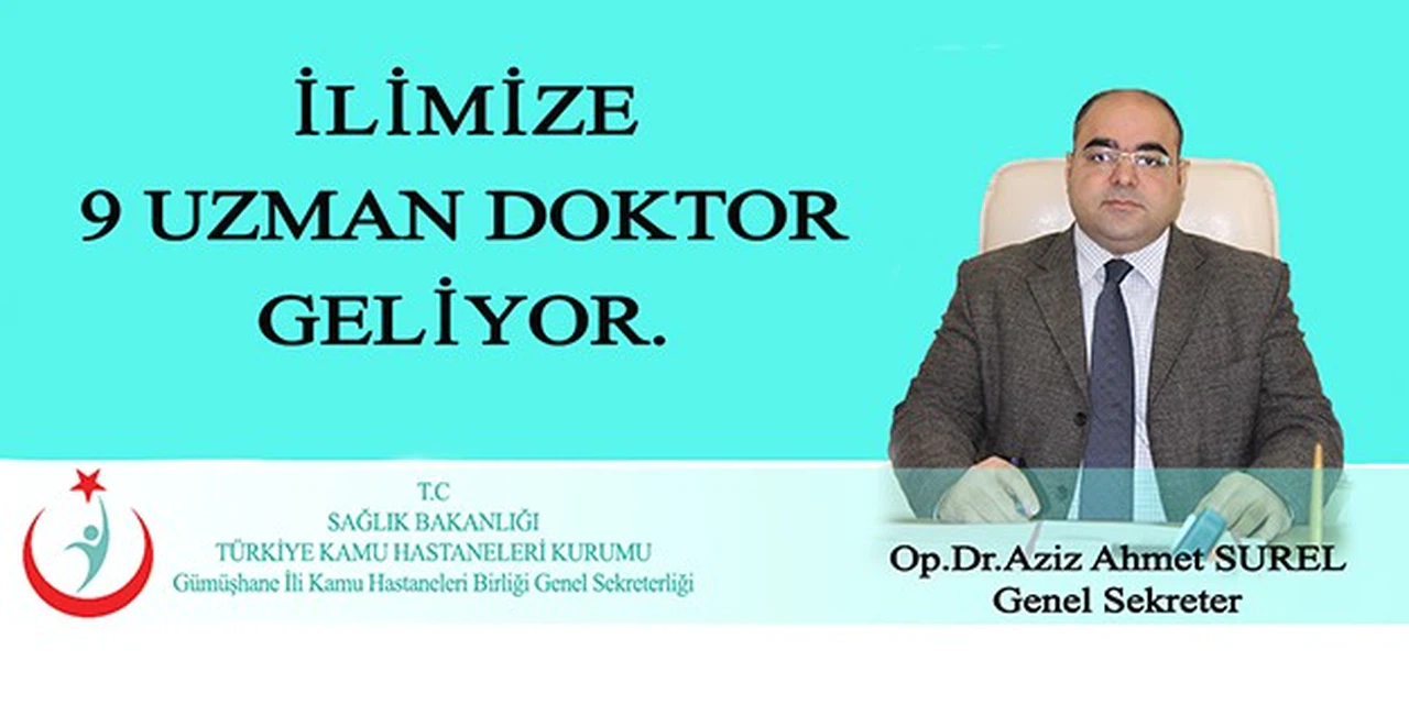 Gümüşhane Kamu Hastaneleri Birliği Genel Sekreteri Op.Dr.Aziz Ahmet Surel, 54. dönem Devlet Hizmet Yükümlülüğü Kurası ile Gümüşhane’ye 9 uzman doktor kadrosu tahsis edildiğini söyledi.