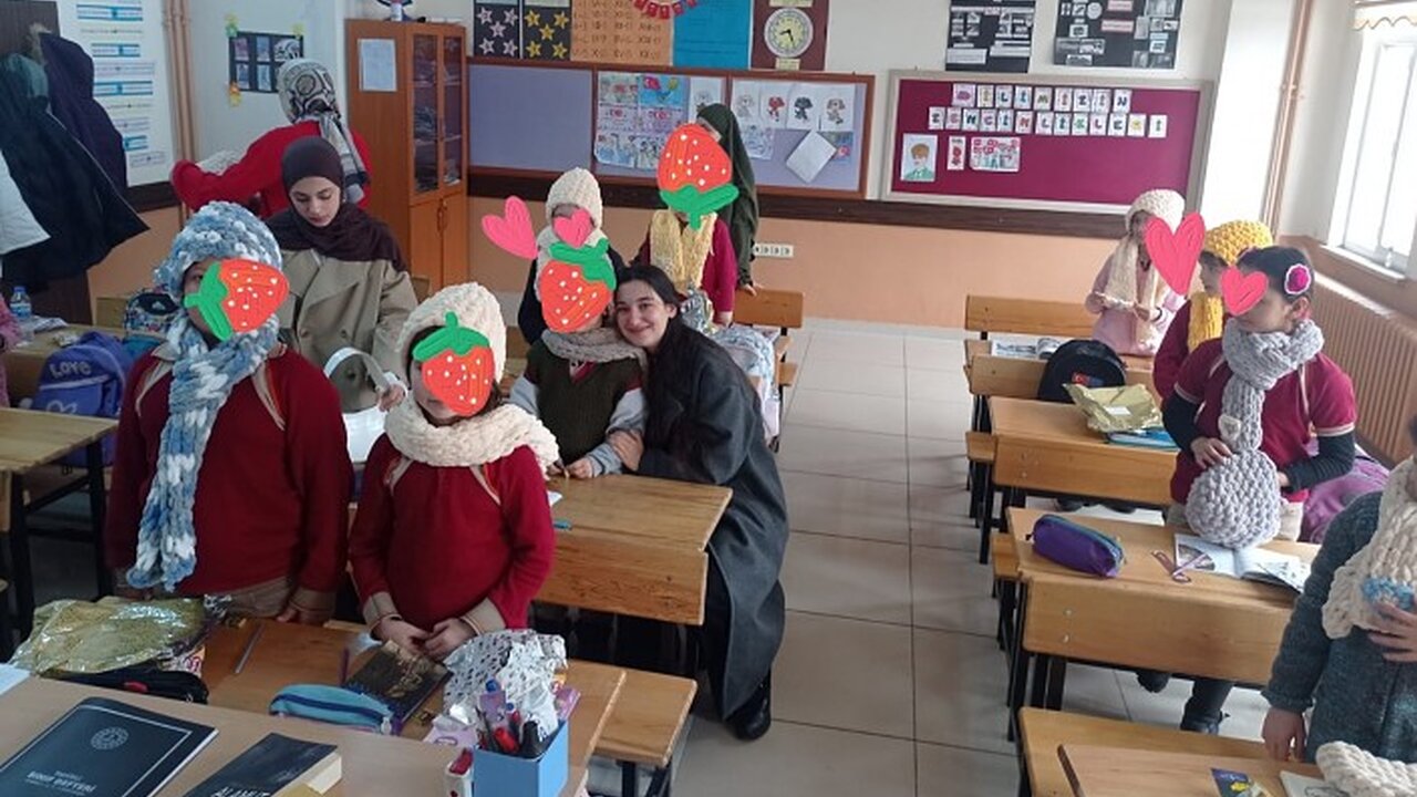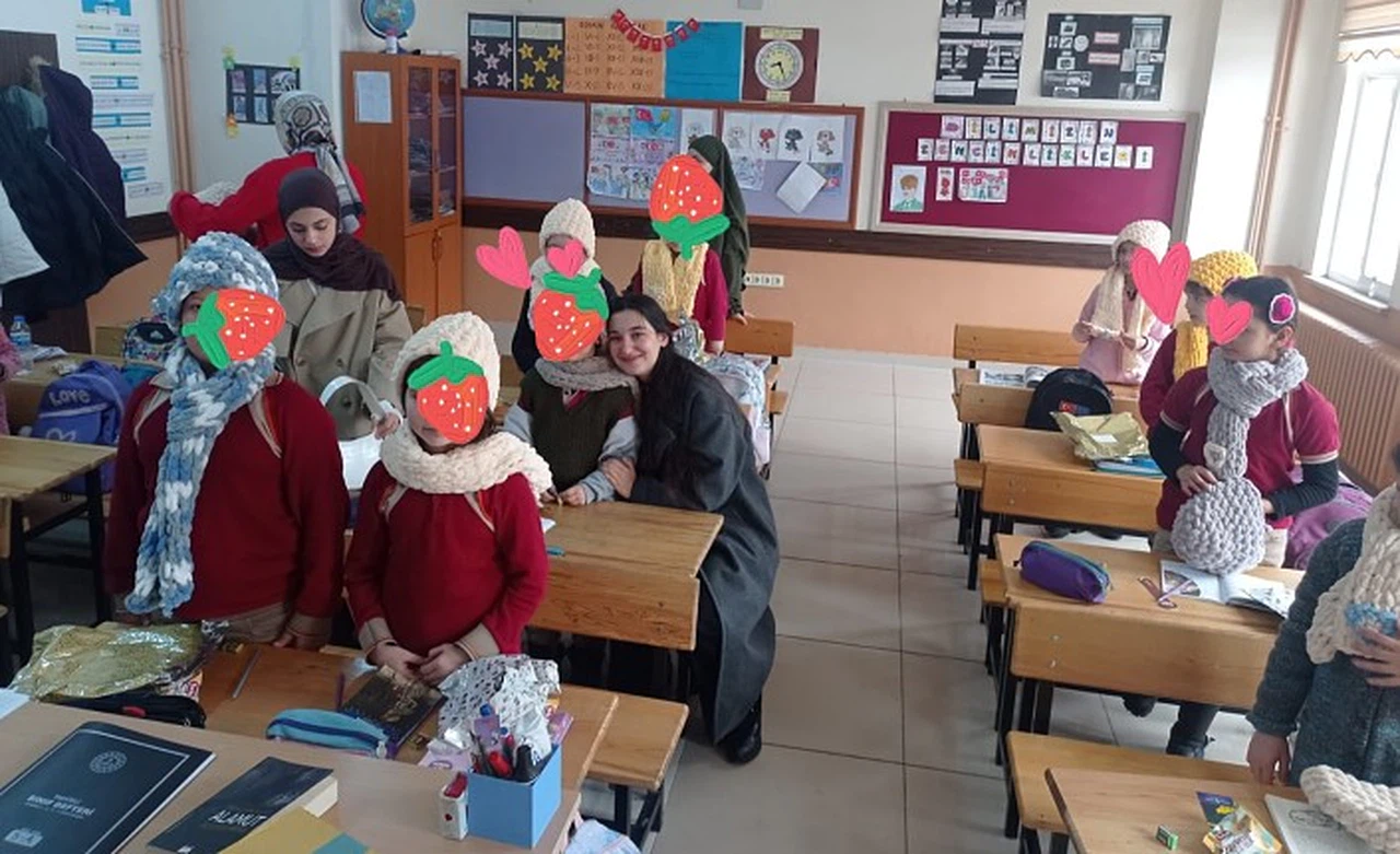 Öğrenciler, Yeşilbük Beldesi’ndeki 51 ilkokul öğrencisine kendi elleriyle hazırladıkları atkı ve bereleri hediye ederek kış günlerinde miniklerin içini ısıttı.