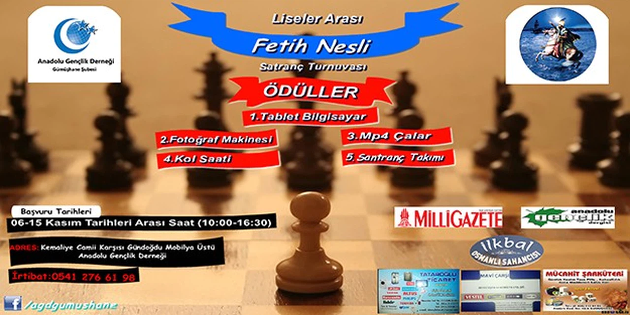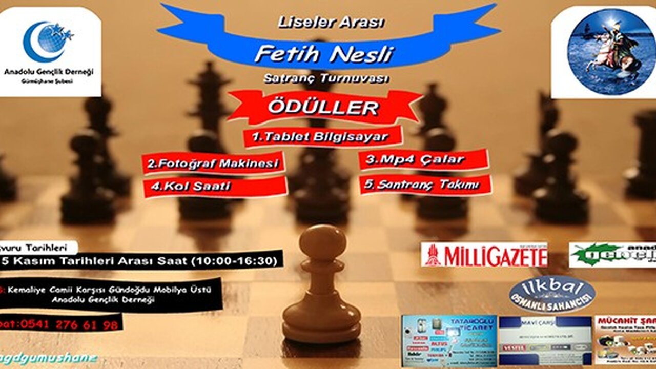 Anadolu Gençlik Derneği (AGD) Gümüşhane Şubesi, liseler arası ödüllü ‘Fetih Nesli Satranç Turnuvası’ düzenliyor.