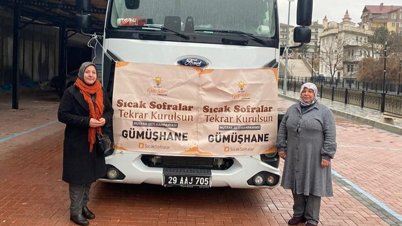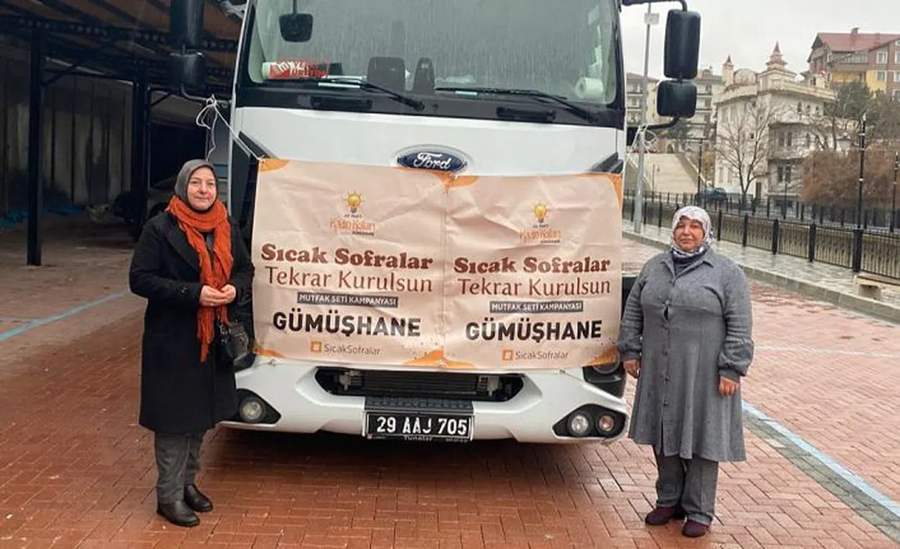 AK Parti Genel Merkez Kadın Kolları Başkanlığı tarafından başlatılan ve tüm şehirlerin katılımıyla desteklenen “Sıcak Sofralar Tekrar Kurulsun Mutfak Seti” kampanyası kapsamında Gümüşhane Kadın Kolları Teşkilatı tüm il, ilçe ve mahalle teşkilat mensuplarının destekleriyle 125 adet mutfak seti kolisi, Belediye Başkanı Ercan Çimen’in destekleriyle 2 bin adet su, oyuncak, 20 ton odun, Halk Eğitimi Merkezi Müdürü Hasan Taş’ın destekleriyle uyku tulumu, yastık ve minderden oluşan malzemelerle dolu tırı yükledi.