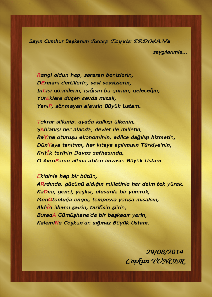 (*) Akrostiş şiir: Bir şiirde dizelerin ilk harflerinin yukarıdan aşağıya doğru sıralandığında anlamlı bir sözcük meydana getirmesi. Divan edebiyatında akrostiş'e muvaşşah ya da istihrac denir.