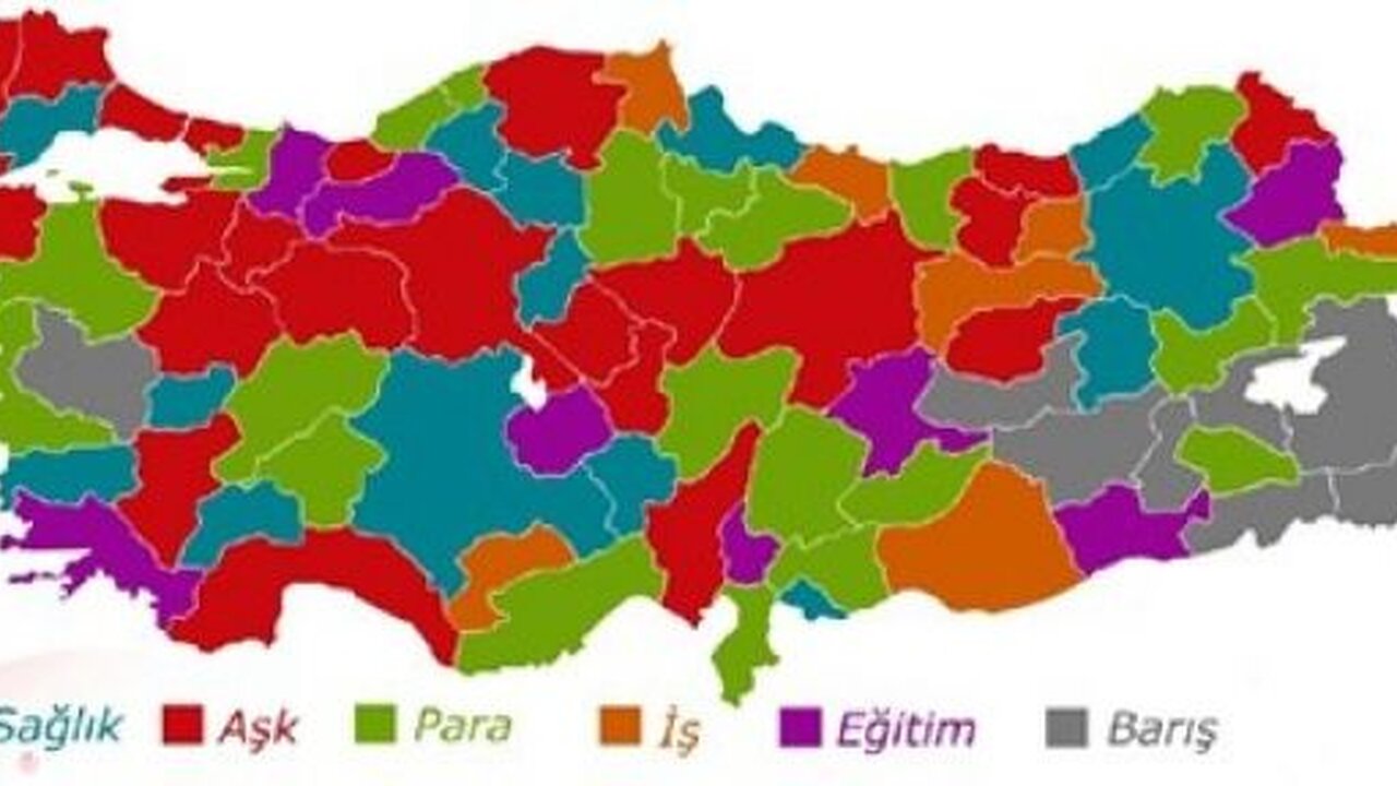 Türkiye genelinde yüzde 29 oranla en çok “aşk” dilendi. Yüzde 27 ile “para” aşkı takip ederken, yüzde 21 ile “sağlık” 3. sırada yer aldı. Yüzde 9,5 oranla “eğitim” 4., yüzde 8.5 ile “iş” 5. ve son olarak yüzde 5 oranla “barış” dilendi.
