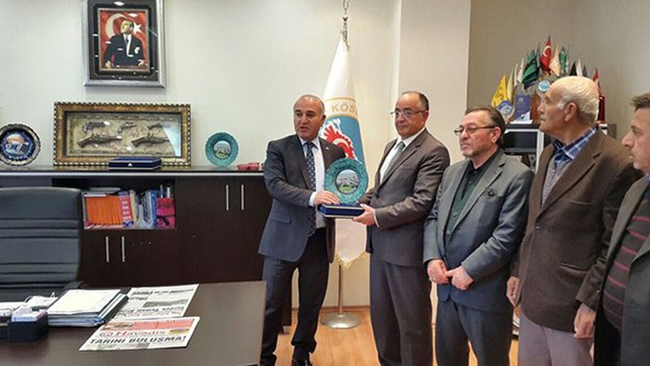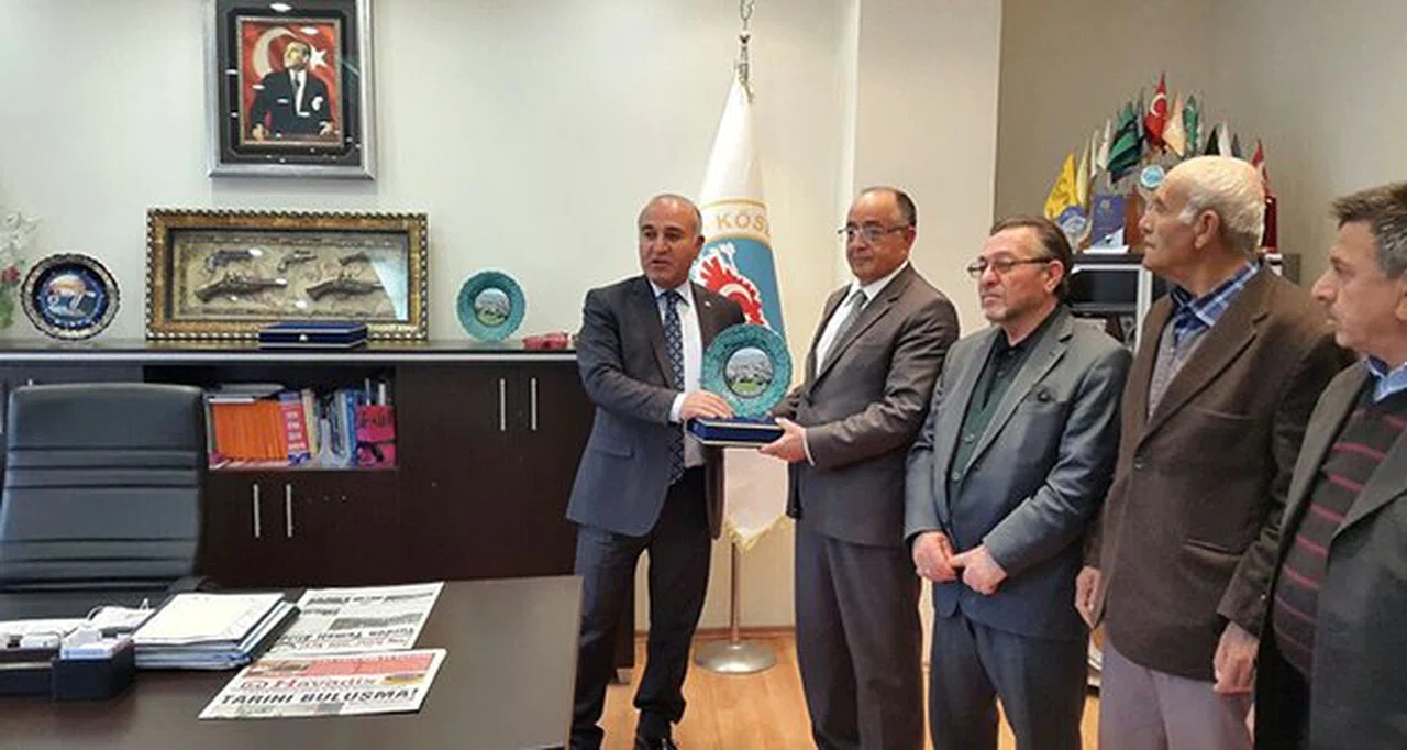 Belediye Başkanlığı makamında Köse İrfan Can Meslek Yüksek Okulunun öğrenci kapasitesinin artırılabilmesi amacıyla yurt yaptırma çalışmalarını başlatan dernek ve bakıf başkanı Mustafa Can ve yönetim kurulu üyelerini kabul eden Başkan Aygün, özverili çalışmaları nedeniyle plaket takdim etti.
