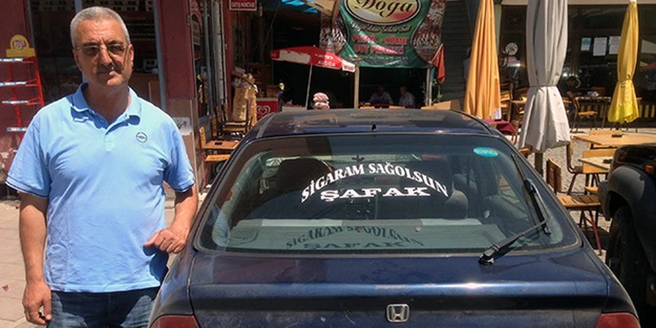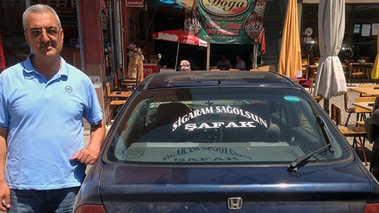 Kelkit'te yaşayan 56 yaşındaki İbrahim Altay, 15 yıl önce bıraktığı sigaraya verdiği parayı biriktirerek aldığı otomobilin arkasına "Sigaram Sağ Olsun" yazdı.