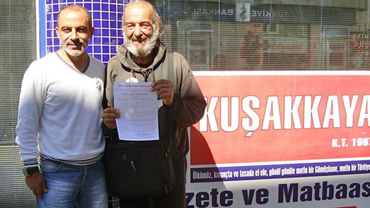 Emekli maaşını harcayarak motosikletiyle başlattığı Türkiye gezisi kapsamında Gümüşhane’ye gelen Ali Nezihi Arın, ‘dünya barışı için dilekçe’ başlığıyla 12 dilde hazırladığı dilekçeyi dağıtıyor.