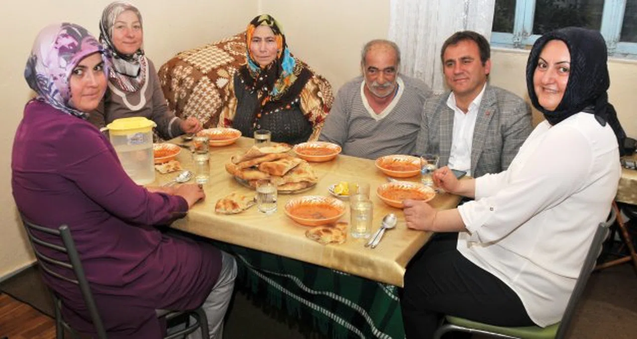 Başkan Çimen, eşi Gülsen Çimen, AK Parti Kadın Kolları Başkanı Şükriye Karabulut Orhan ve Kadın Kolları Yönetim Kurulu Üyesi Münire Şeyhoğlu ile birlikte çat kapı bir vatandaşın evine konuk olarak iftar yapıyor.