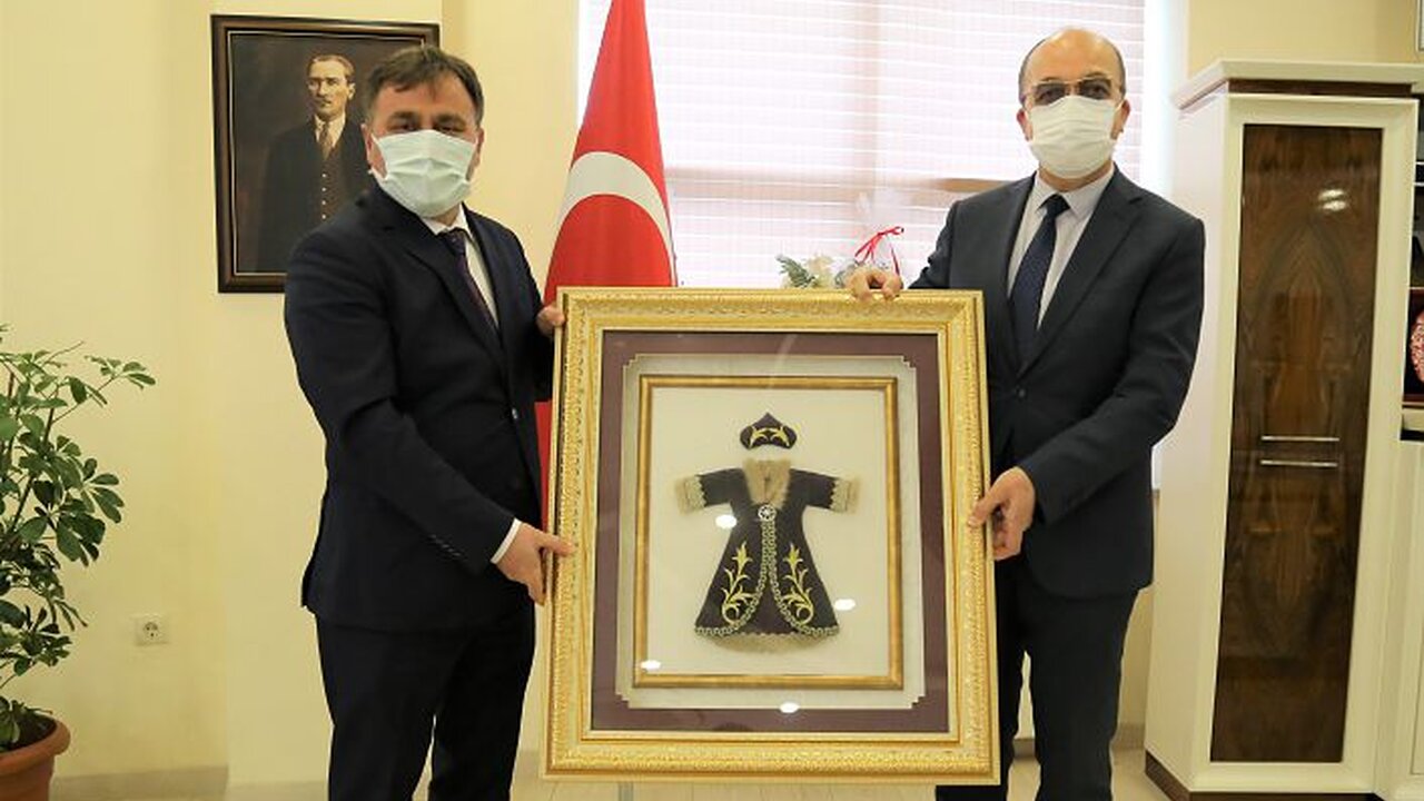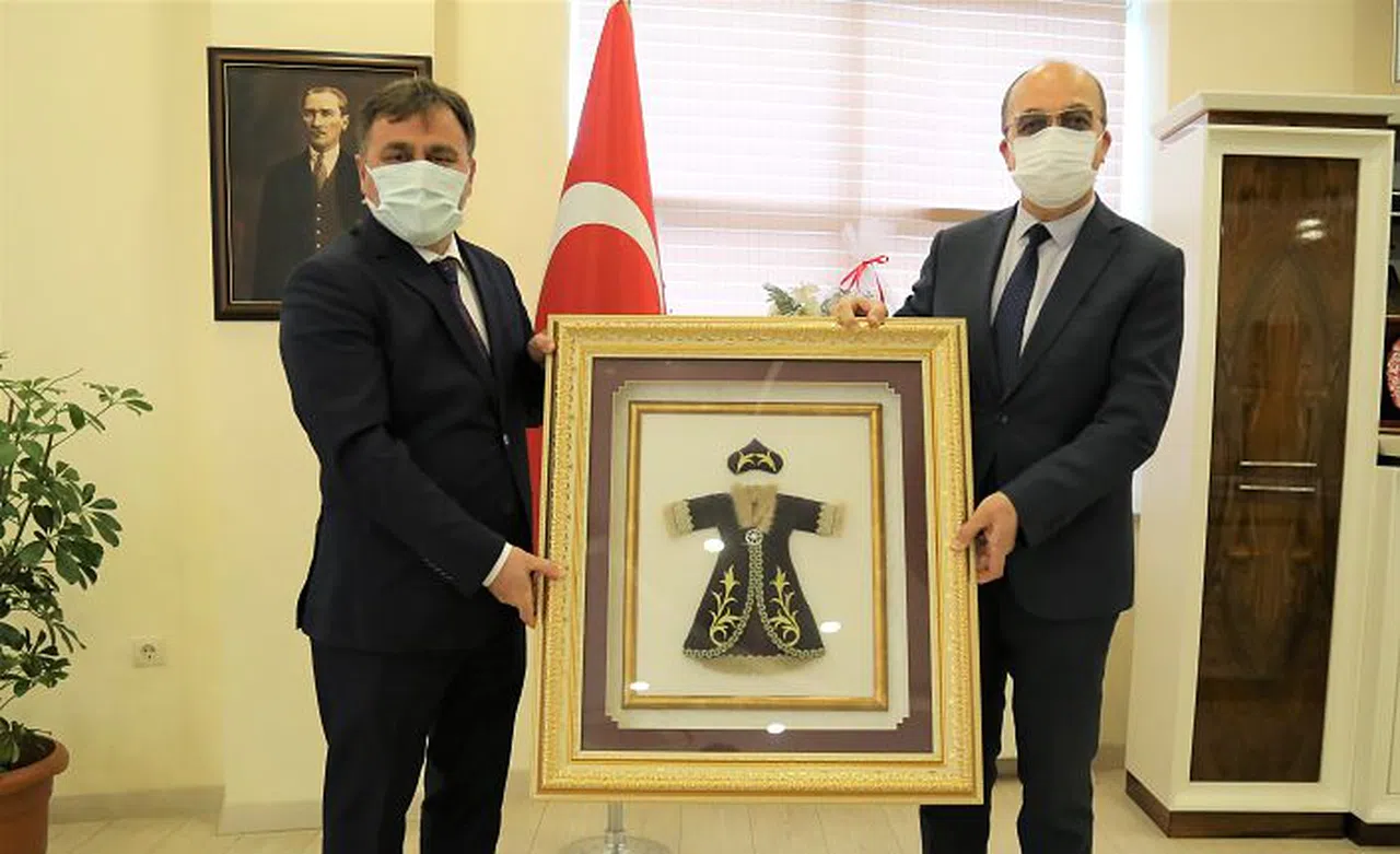 Rektörlük makamında gerçekleştirilen ziyarette Belediye Başkanı Ercan Çimen tarafından Rektör Zeybek’e üzerinde komutanların savaşa giderken giydiği minyatür kaftanın yer aldığı bir tablo ile Kur’an-ı Kerim hediye edildi.
