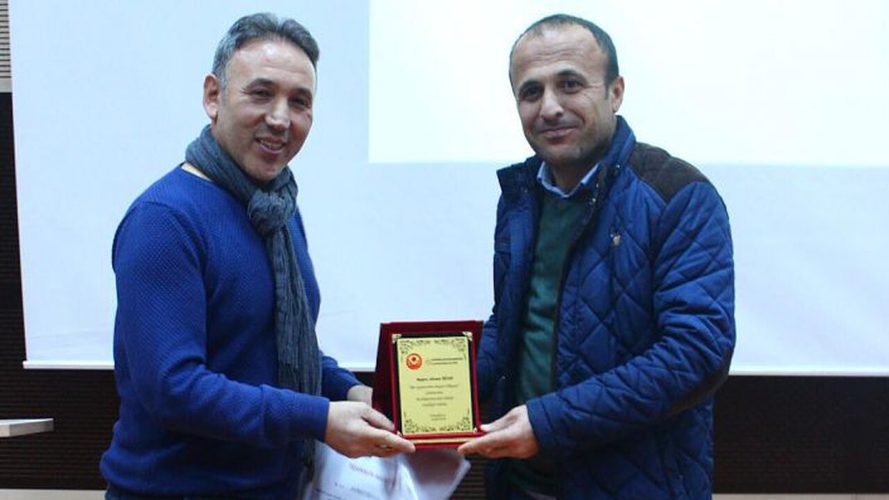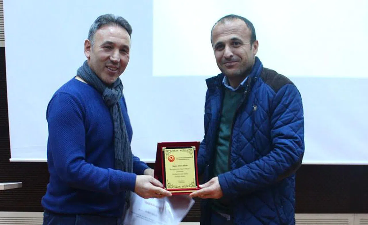 Konferansın sonunda İletişim Fakültesi Dekan Yardımcısı Dr. Öğretim Üyesi Ali Özcan tarafında Ahmet Bilge’ye teşekkür plaketi takdim etti.