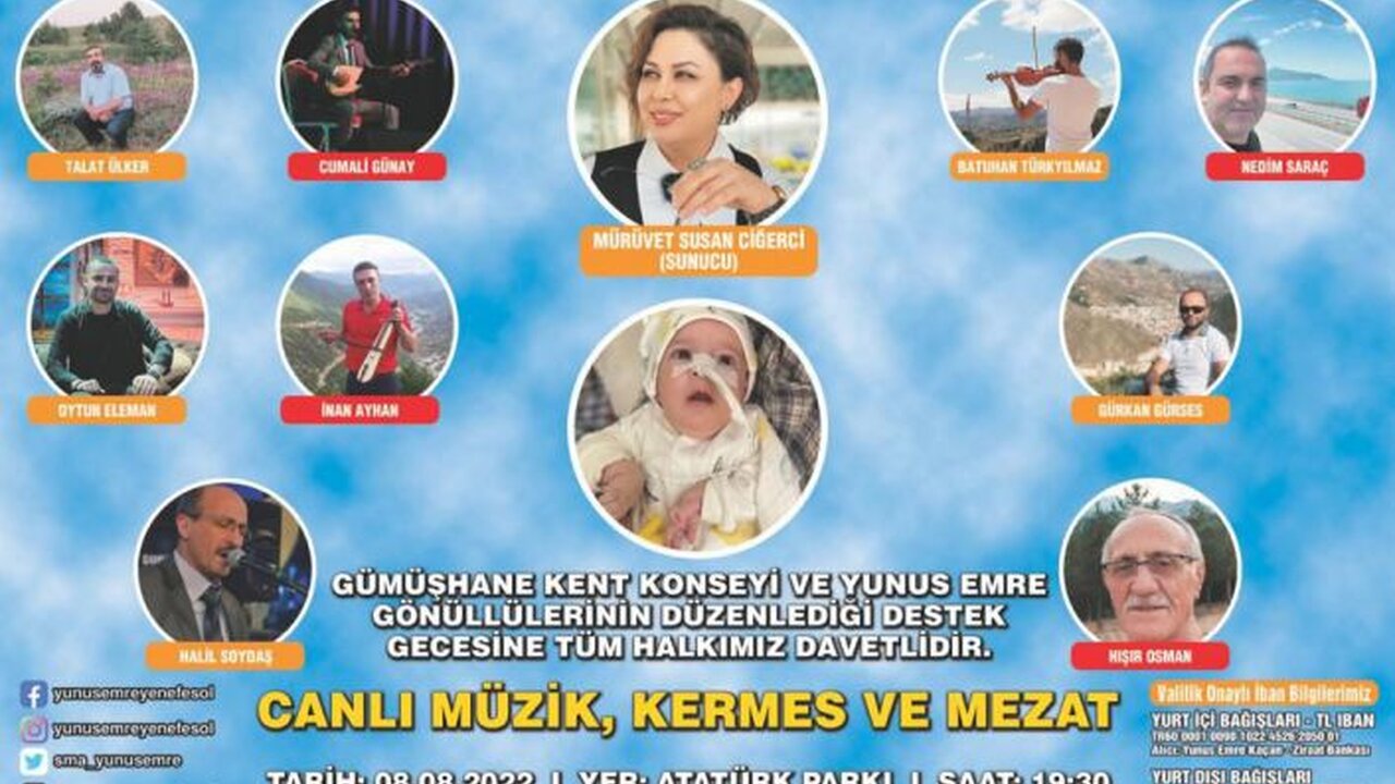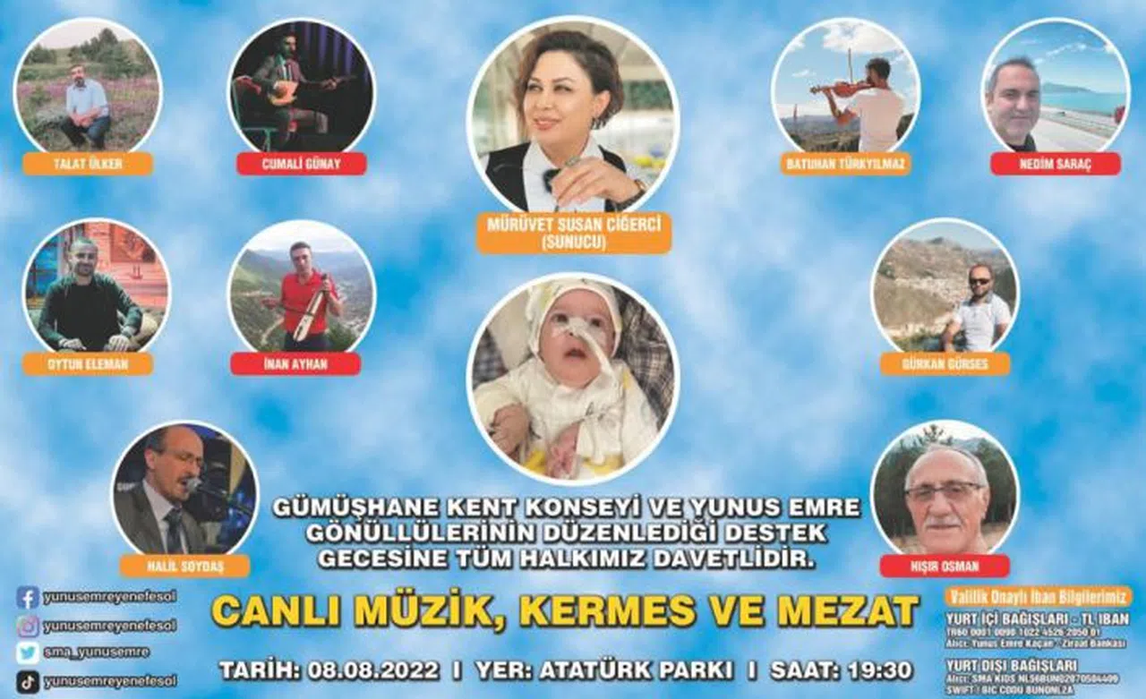 Gümüşhane Kent Konseyi ve SMA hastası bebeğimiz Yunus Emre'nin gönüllülerinin organizasyonunda 8 Ağustos Pazartesi günü Atatürk Parkında saat 19.30'da yapılacak programın sunuculuğunu Mürüvet Susan Ciğerci üstlendi.